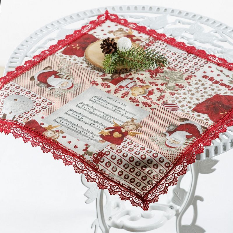 Декоративная сервировочная салфетка выполнена из смесовой хлопковой ткани с рождественскими мотивами и декорирована ажурной тесьмой бордового цвета.