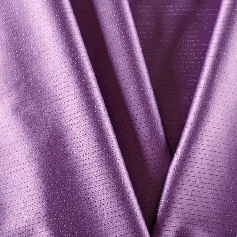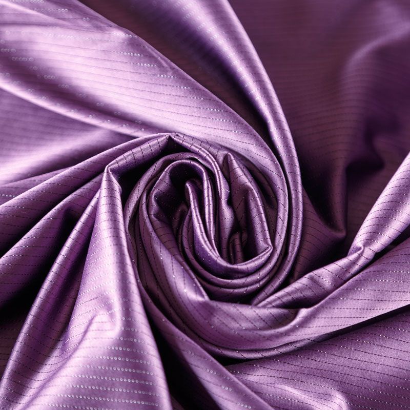 Сатин-коттон в сиреневом оттенке с тонкими полосками люрексовой нити. Поверхность гладкая со сдержанным блеском, ткань средней плотности,  не толстая, хорошо держит форму, тянется за счет эластана в составе. Подойдет для пошива костюма, жакета, юбки, платья, брюк или шорт.