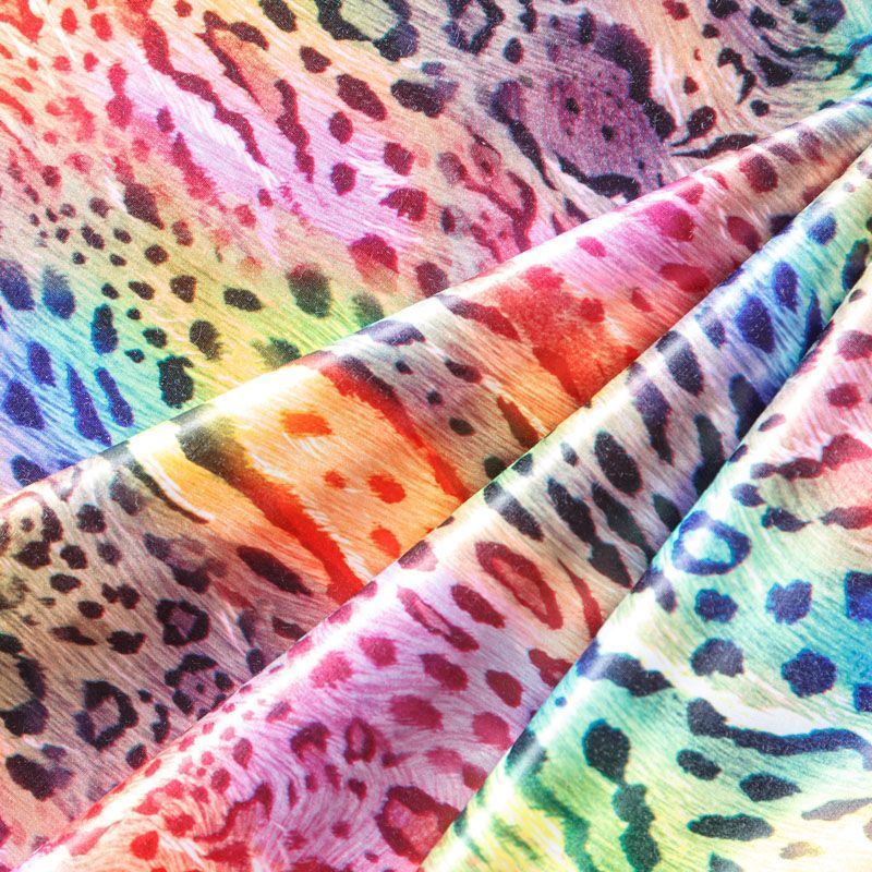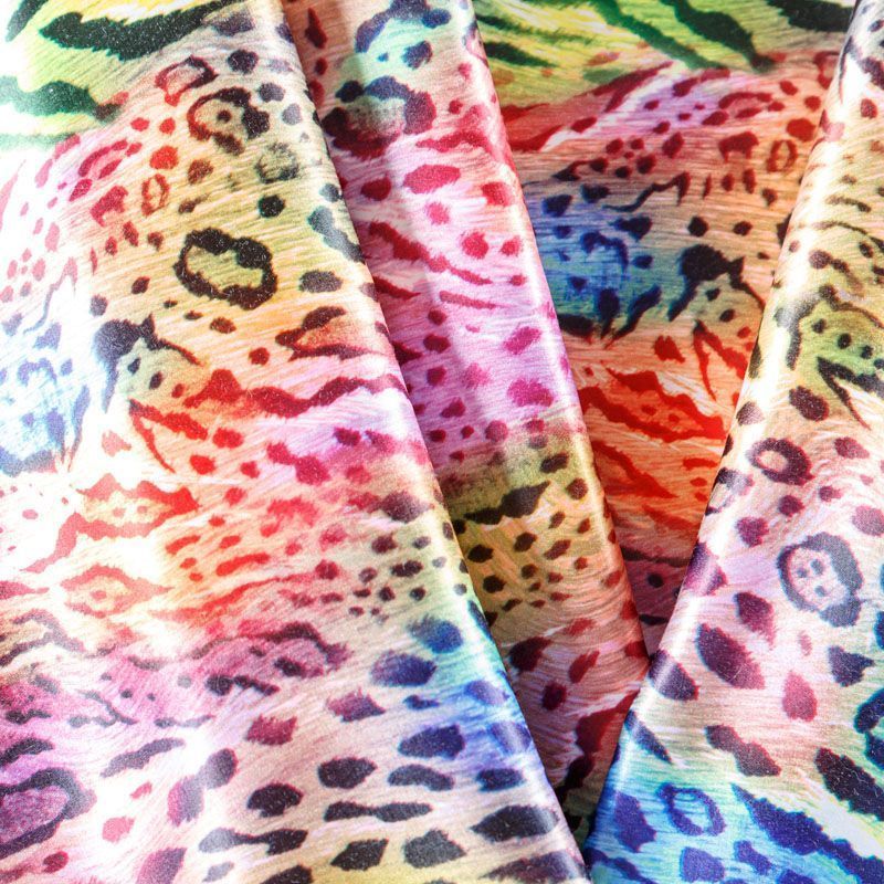 Сатин-коттон в ярких оттенках со стилизованным анималистическим принтом, с гладкой поверхностью со сдержанным блеском, ткань средней плотности,  не толстая, хорошо держит форму, тянется за счет эластана в составе. Подойдет для пошива костюма, жакета, юбки, платья, брюк или шорт.