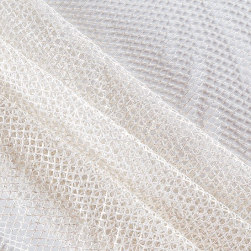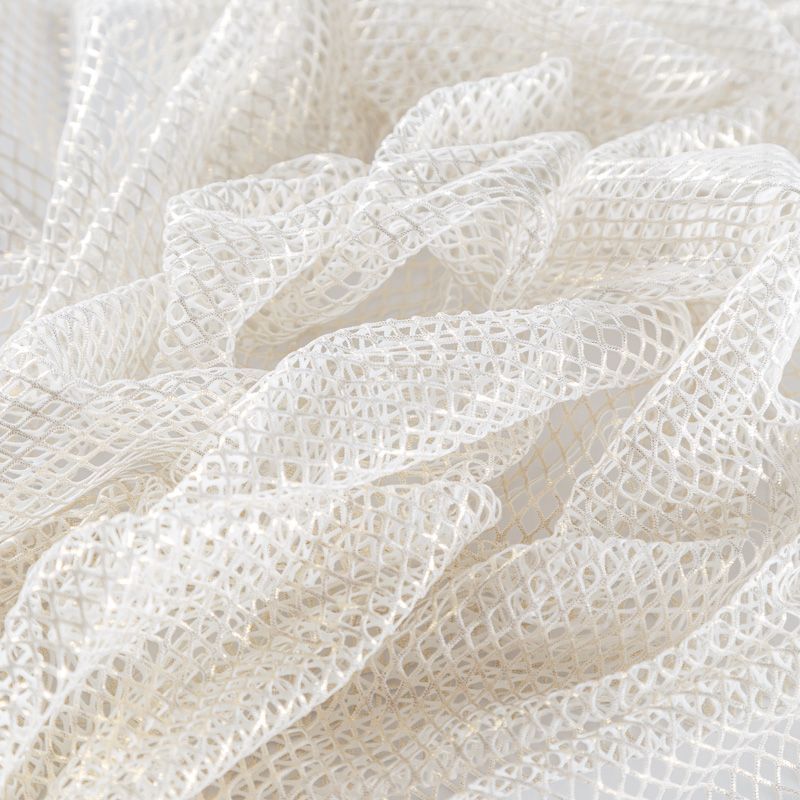 Рельефный полупрозрачный материал с сетчатой структурой. Поверхность полотна с металлизированным золотым напылением, которое придает материалу легкий блеск и мерцание. Полотно мягкое, растяжимое во всех направлениях. Сетки нашли свое применение в процессе пошива и последующего декора вечерних нарядов, свадебных платьев, спортивной одежды, театральных костюмов.