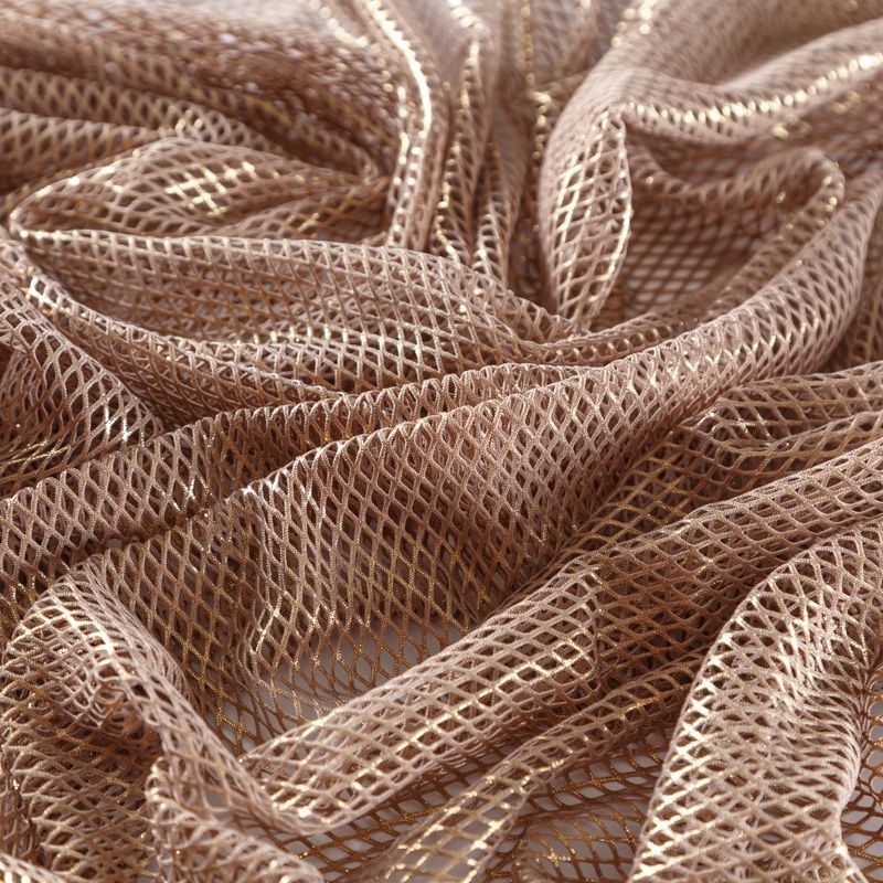Рельефный полупрозрачный материал с сетчатой структурой. Поверхность полотна с металлизированным золотым напылением, которое придает материалу легкий блеск и мерцание. Полотно мягкое, растяжимое во всех направлениях. Сетки нашли свое применение в процессе пошива и последующего декора вечерних нарядов, свадебных платьев, спортивной одежды, театральных костюмов.