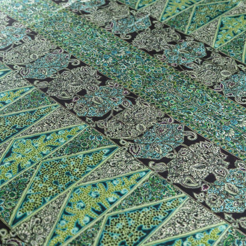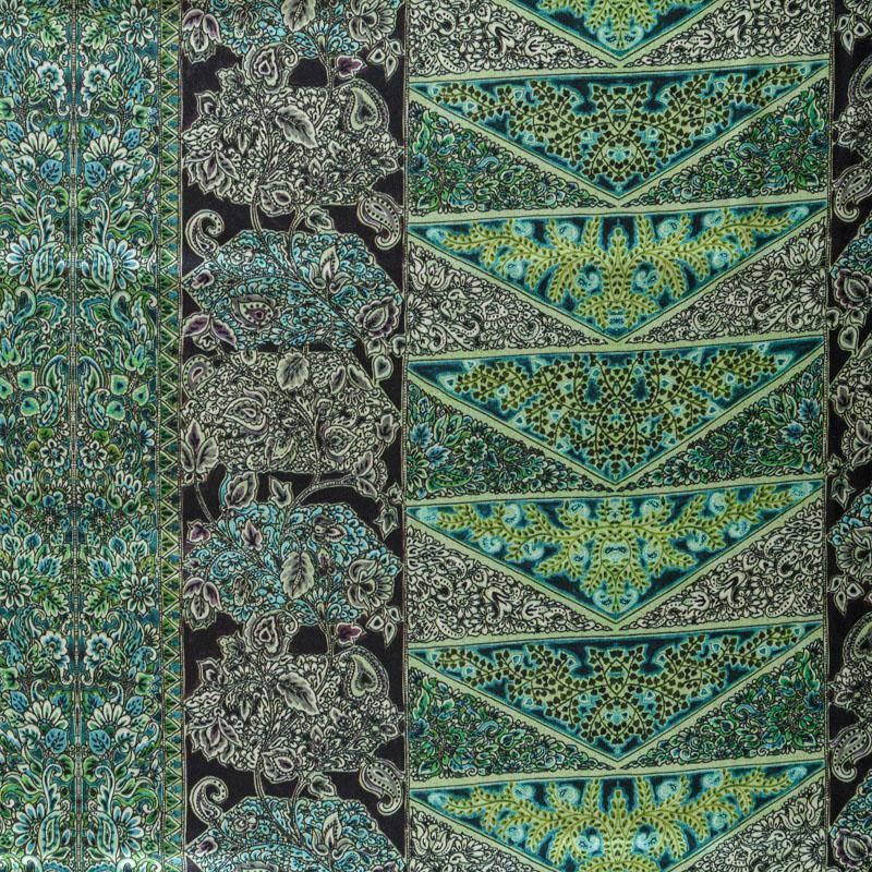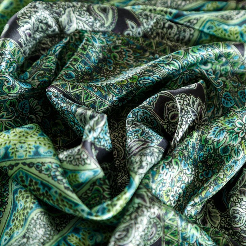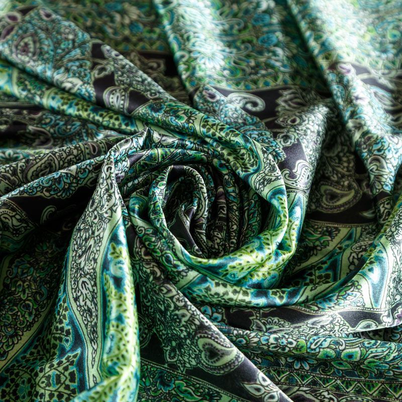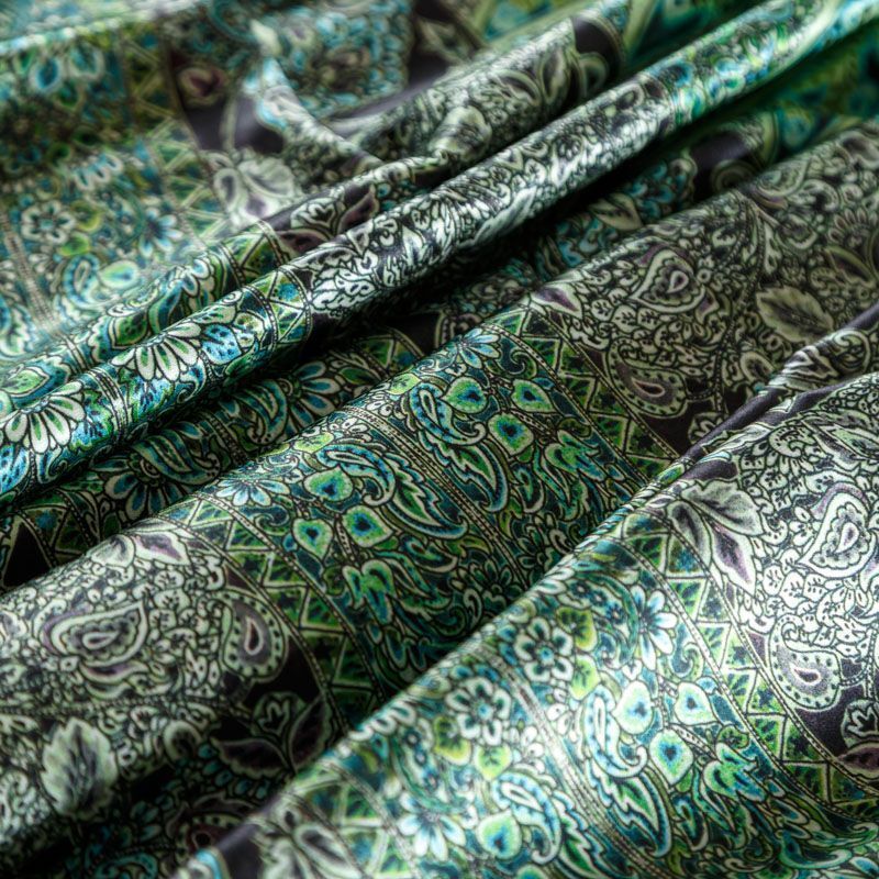 Итальянский атласный шелк с богатым орнаментом в зеленых оттенках.  Ткань тонкая, не просвечивает, отлично драпируется, легкая и струящаяся, тянется за счет эластана в составе. Идеально подойдет для пошива платьев и сарафанов расклешенных моделей, с воланами, летящих юбок, топов, блузки, костюма в пижамном стиле.