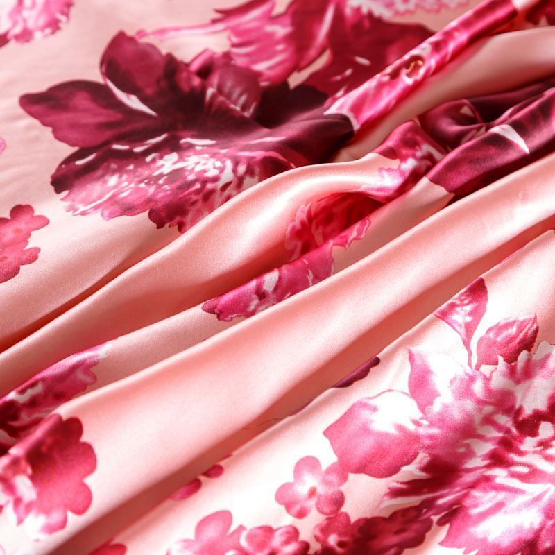 Итальянский атласный шелк с цветочным принтом на розовом фоне. Ткань тонкая, не просвечивает, отлично драпируется, легкая и струящаяся. Идеально подойдет для пошива платьев и сарафанов расклешенных моделей, с воланами, летящих юбок, топов, блузки, костюма в пижамном стиле.