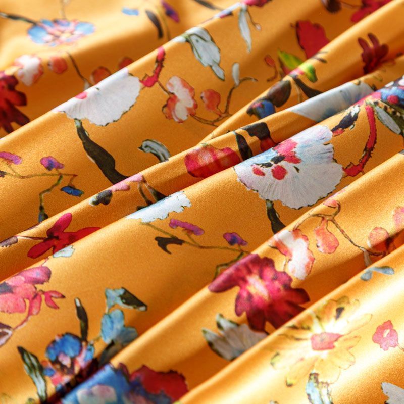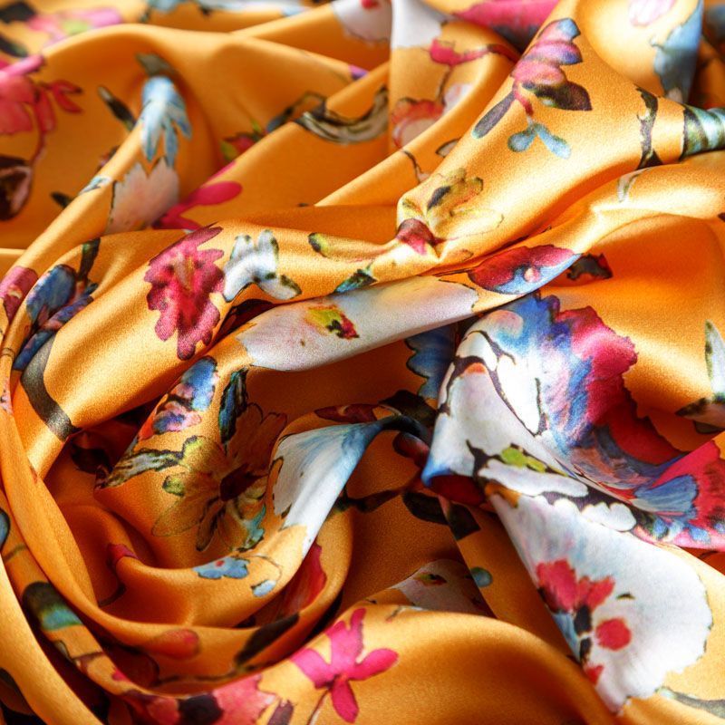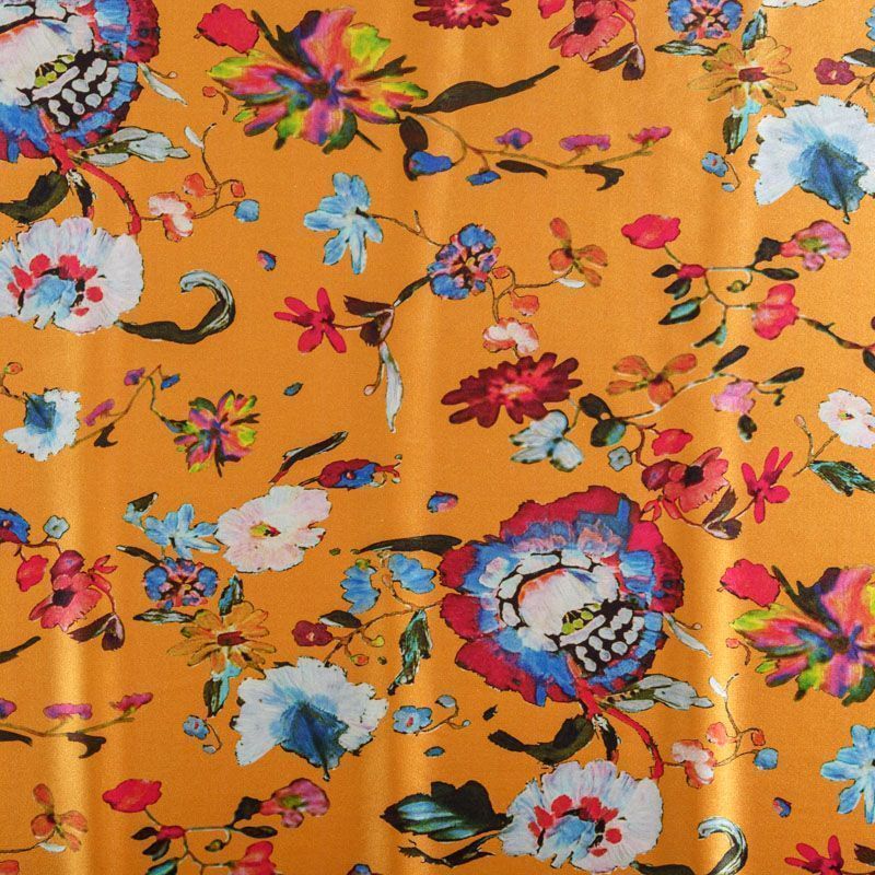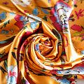 Итальянский атласный шелк со стилизованным цветочным принтом на ярком фоне. Ткань тонкая, не просвечивает, отлично драпируется, легкая и струящаяся, тянется за счет эластана в составе. Идеально подойдет для пошива платьев и сарафанов расклешенных моделей, с воланами, летящих юбок, топов, блузки, костюма в пижамном стиле.