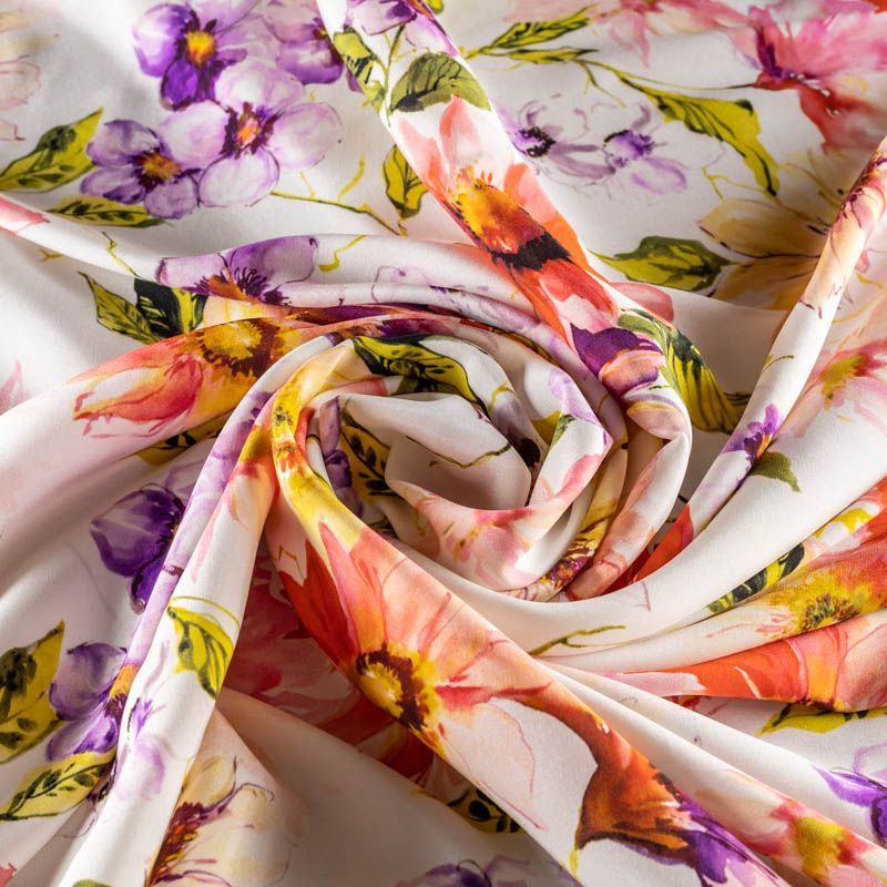 Итальянский матовый шелк с акварельным цветочным  принтом на молочном фоне, тонкий, слегка прозрачный, отлично драпируется, тянется за счет эластана в составе, легкий и струящийся с креповой поверхностью. Идеально подойдет для пошива платьев и сарафанов расклешенных моделей, с воланами, летящих юбок, топов, блузки, костюма в пижамном стиле.