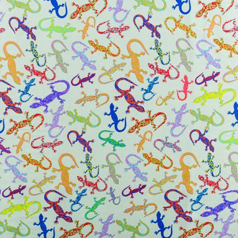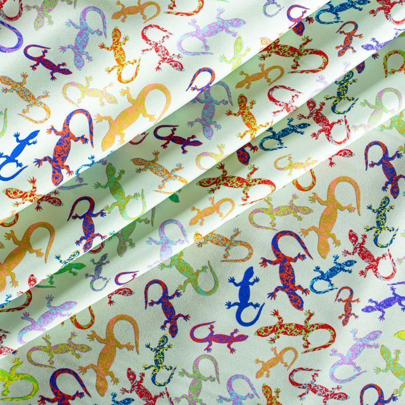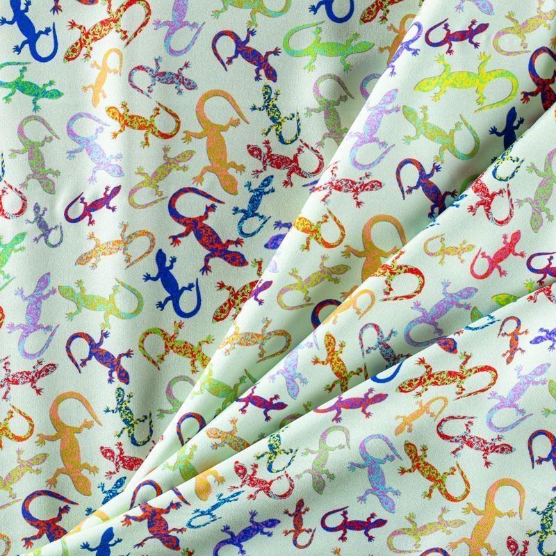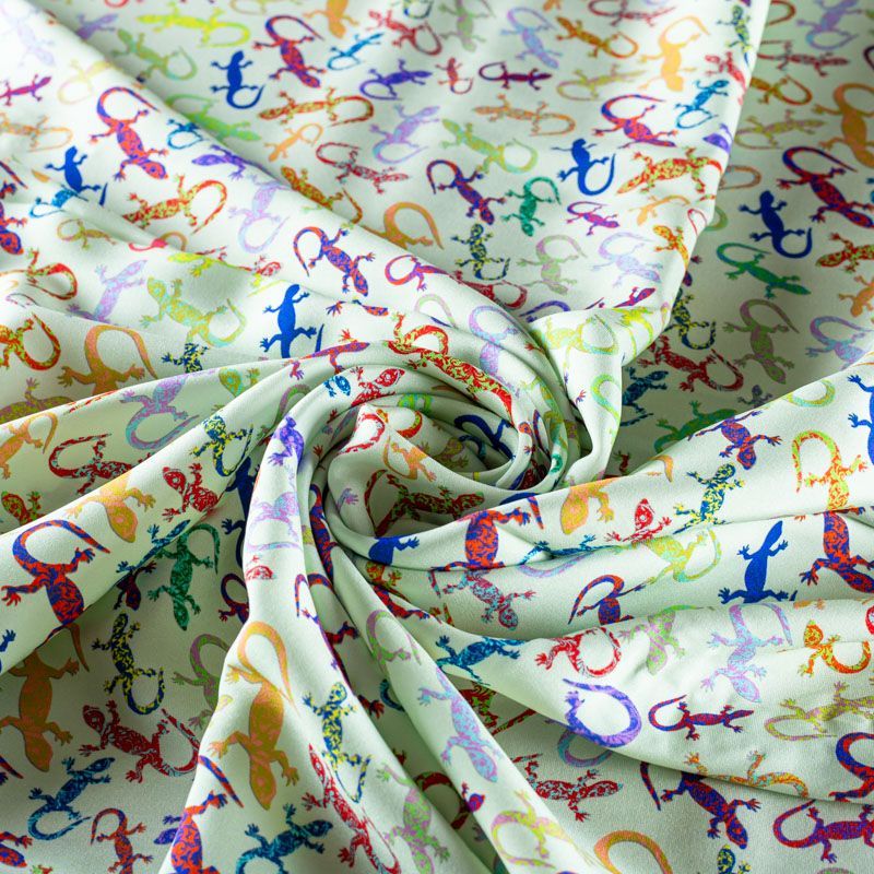 Итальянский шелк с матовой лицевой поверхностью и атласной изнанкой со стилизованными цветными ящерками на свежем светло-салатовом фоне, тонкий, слегка прозрачный, отлично драпируется, не много тянется за счет эластана в составе, легкий и струящийся. Идеально подойдет для пошива платьев и сарафанов расклешенных моделей, с воланами, летящих юбок, топов, блузки, костюма в пижамном стиле.