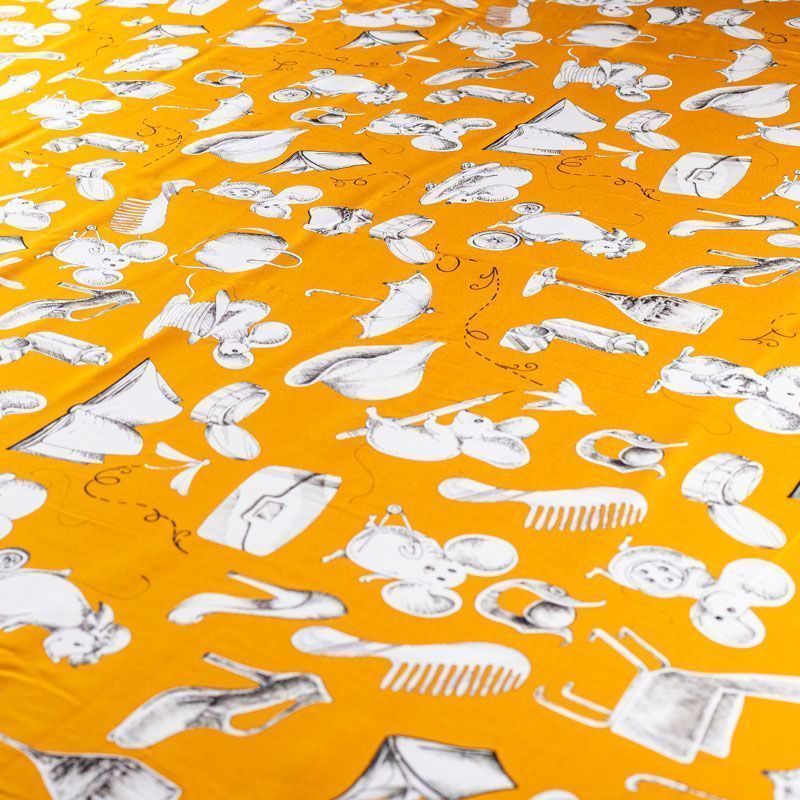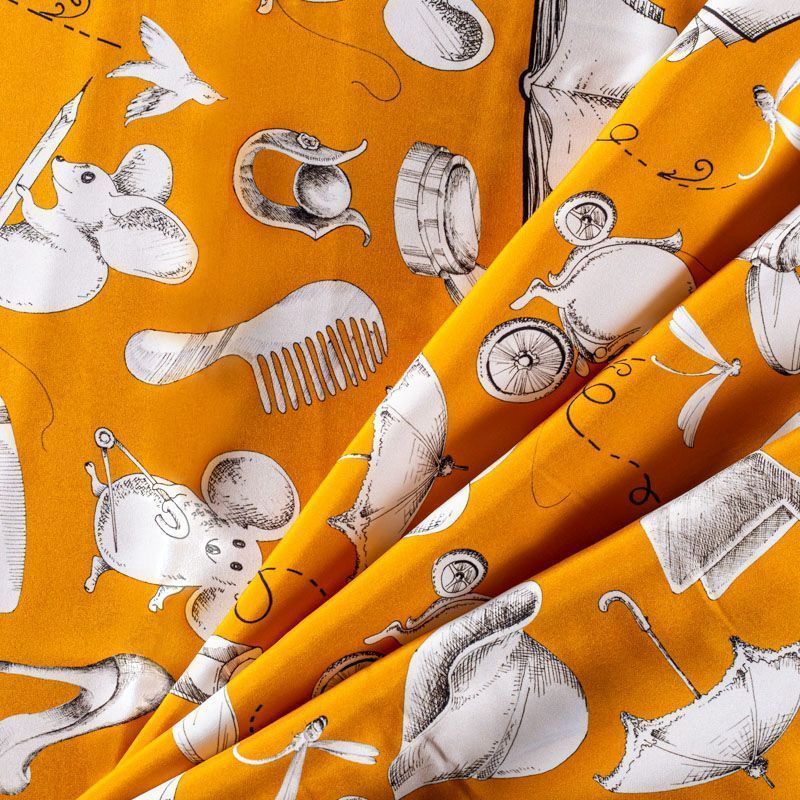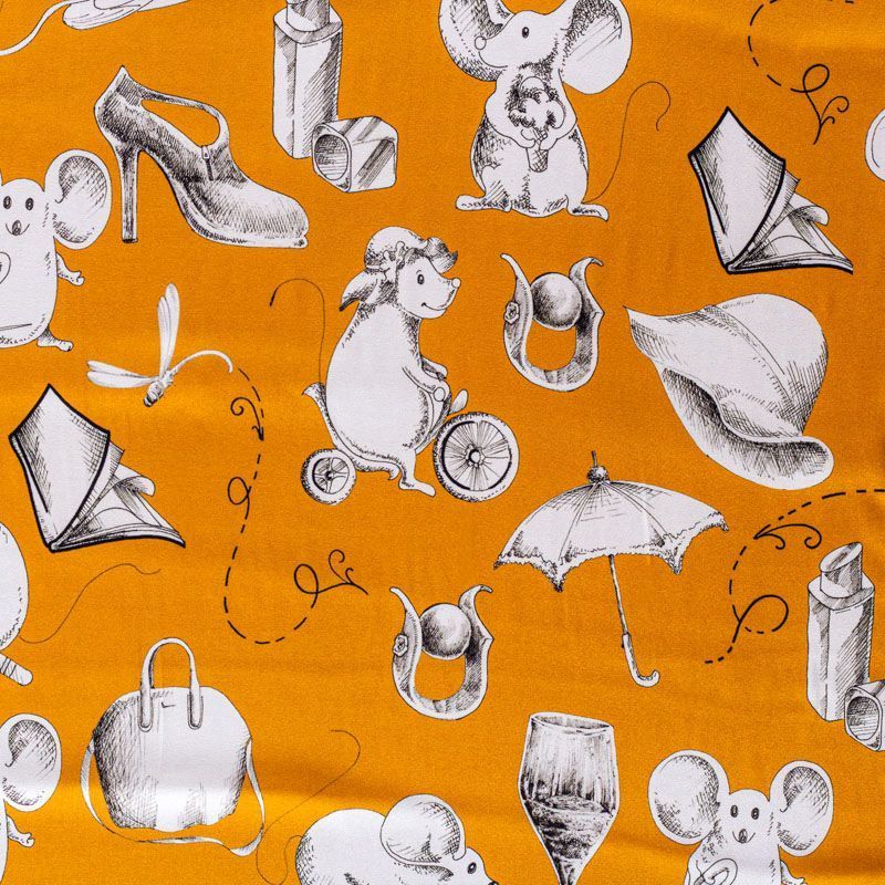 Итальянский матовый шелк благородного шафранового оттенка с узнаваемым игривым принтом от известного бренда. Ткань тонкая, не просвечивается, отлично драпируется, легкая и струящаяся, тянется за счет эластана в составе, лицевая сторона креповая, изнанка - атласная. Идеально подойдет для пошива платьев и сарафанов расклешенных моделей, с воланами, рюшами, летящих юбок, топов, блузки, рубашки, костюма в пижамном стиле.