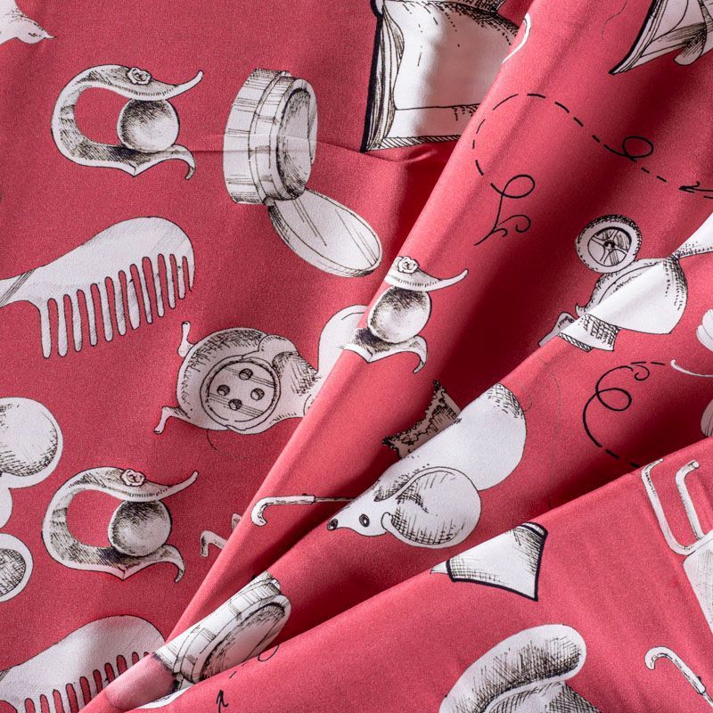 Итальянский матовый шелк кораллового оттенка с узнаваемым игривым принтом от известного бренда. Ткань тонкая, не просвечивается, отлично драпируется, легкая и струящаяся, тянется за счет эластана в составе, лицевая сторона креповая, изнанка - атласная. Идеально подойдет для пошива платьев и сарафанов расклешенных моделей, с воланами, рюшами, летящих юбок, топов, блузки, рубашки, костюма в пижамном стиле.