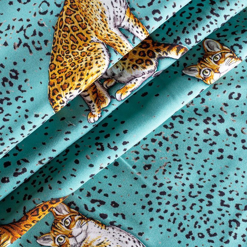 Итальянский матовый шелк бирюзового оттенка с узнаваемым принтом диких кошек от известного бренда. Ткань тонкая, не просвечивается, отлично драпируется, легкая и струящаяся, тянется за счет эластана в составе, лицевая сторона креповая, изнанка - атласная. Идеально подойдет для пошива платьев и сарафанов расклешенных моделей, с воланами, рюшами, летящих юбок, топов, блузки, рубашки, костюма в пижамном стиле.