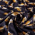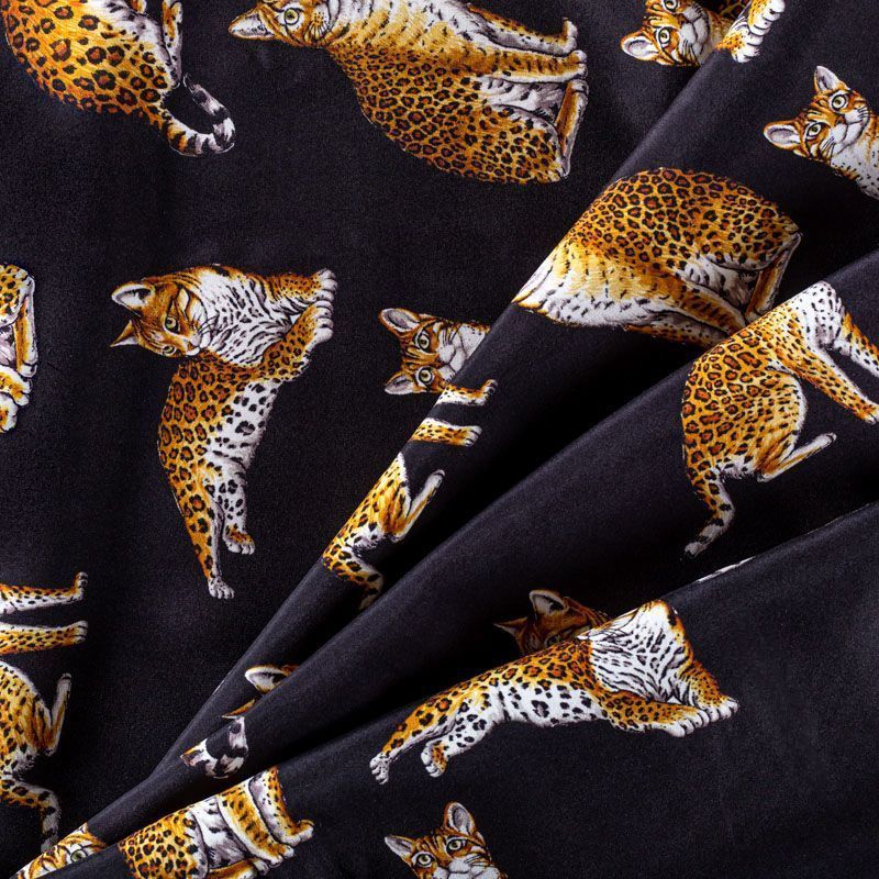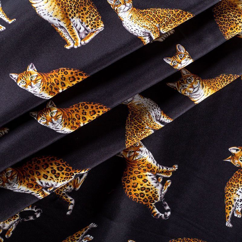 Итальянский матовый шелк черного оттенка с узнаваемым принтом диких кошек от известного бренда. Ткань тонкая, не просвечивается, отлично драпируется, легкая и струящаяся, тянется за счет эластана в составе, лицевая сторона креповая, изнанка - атласная. Идеально подойдет для пошива платьев и сарафанов расклешенных моделей, с воланами, рюшами, летящих юбок, топов, блузки, рубашки, костюма в пижамном стиле.