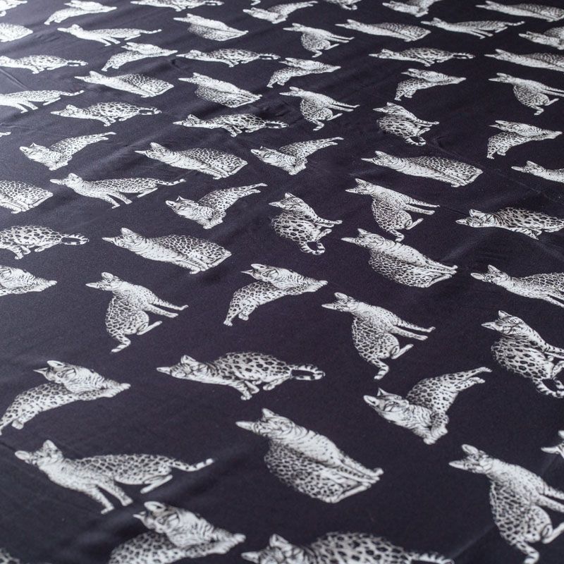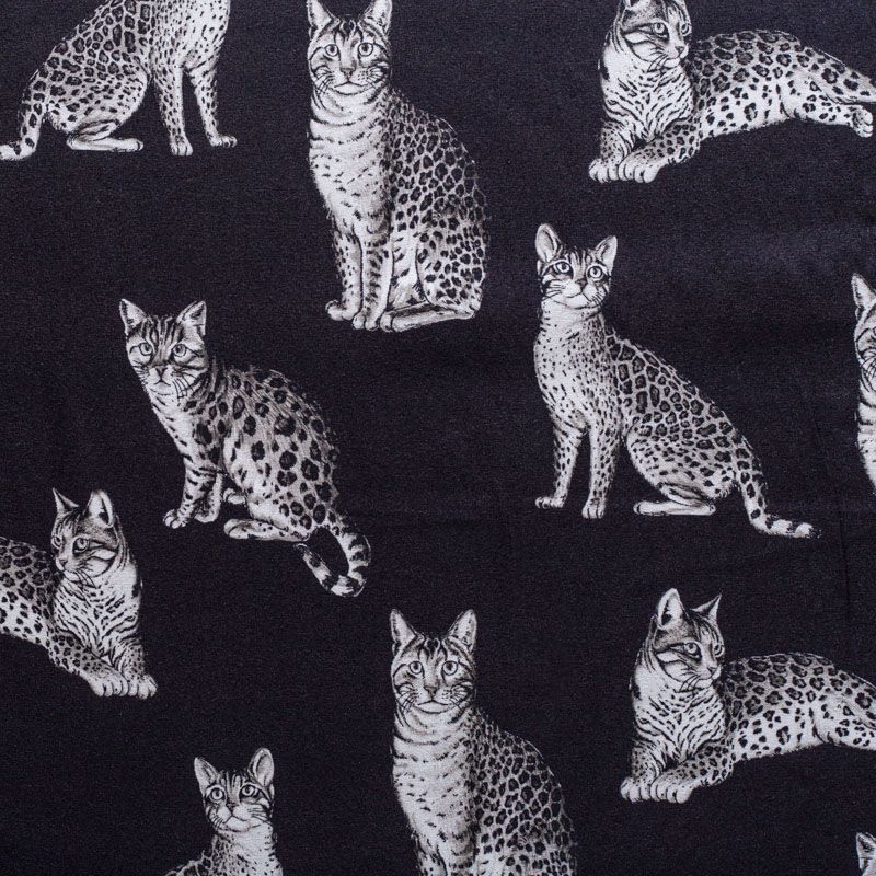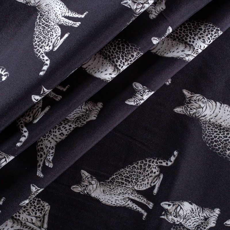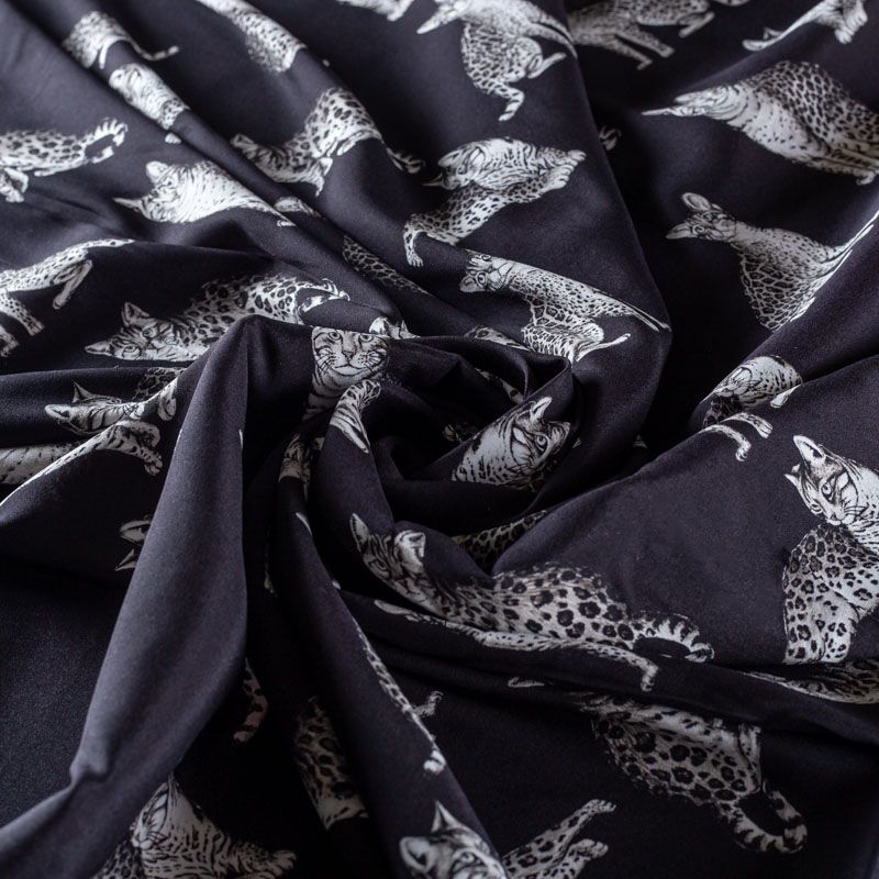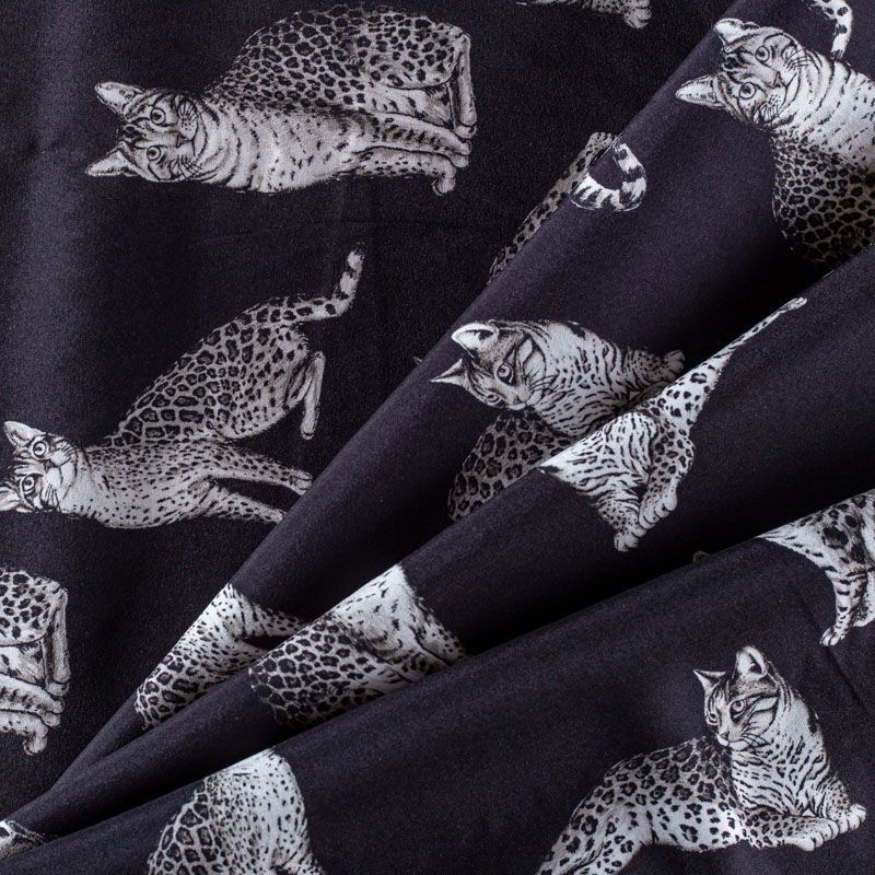Итальянский матовый шелк черного цвета с узнаваемым принтом диких кошек от известного бренда. Ткань тонкая, не просвечивается, отлично драпируется, легкая и струящаяся, тянется за счет эластана в составе, лицевая сторона креповая, изнанка - атласная. Идеально подойдет для пошива платьев и сарафанов расклешенных моделей, с воланами, рюшами, летящих юбок, топов, блузки, рубашки, костюма в пижамном стиле.