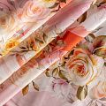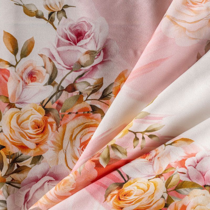 Итальянский шелк с цветочным принтом в нежных оттенках на белом фоне, тонкий, слегка прозрачный, отлично драпируется, тянется за счет эластана в составе, легкий и струящийся с атласной поверхностью. Идеально подойдет для пошива платьев и сарафанов расклешенных моделей, с воланами, летящих юбок, топов, блузы, костюма в пижамном стиле.