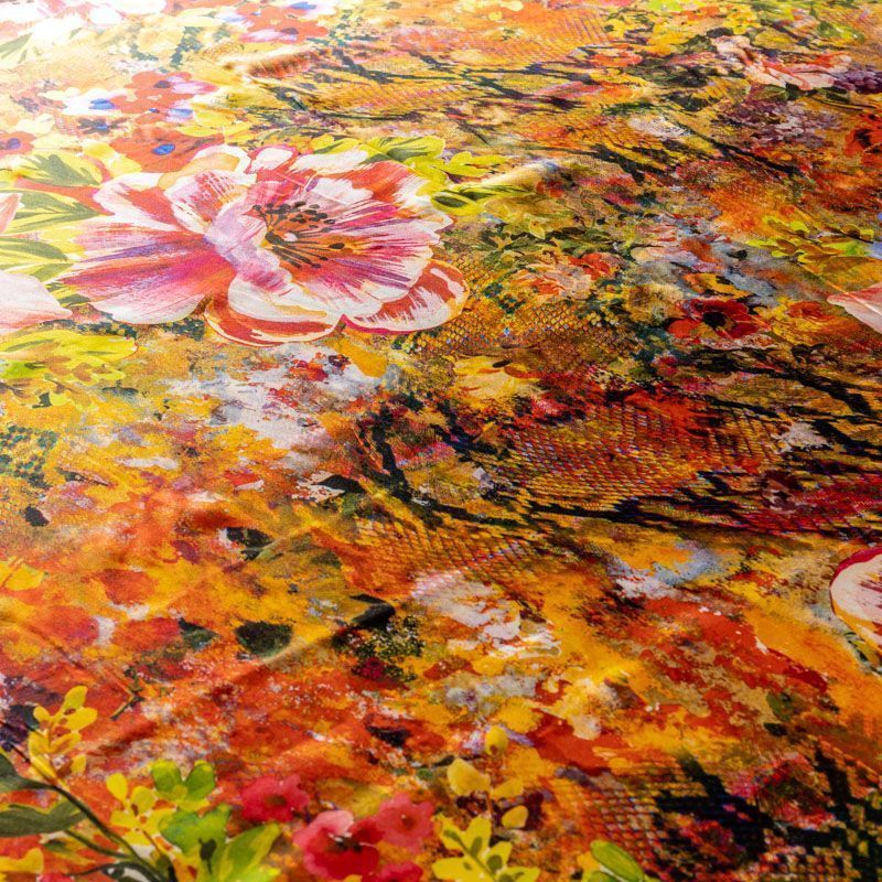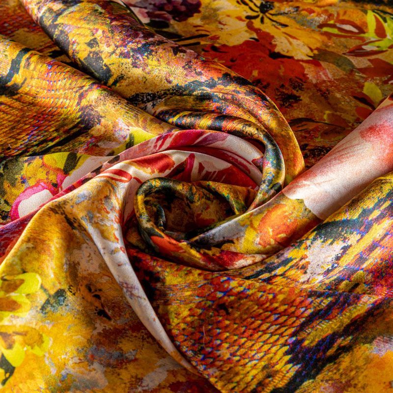 Итальянский натуральный шелк с атласной поверхностью, легкий, струящийся, хорошо драпируется, тянется за счет эластана в составе. Сочетание актуальных в текущем сезоне цветочного и анималистического принтов в насыщенных оттенках будет уместно  для пошива летнего сарафана, платья, блузки, костюма в пижамном стиле, широких брюк или юбки.
