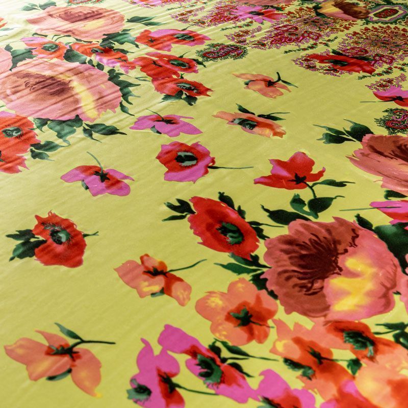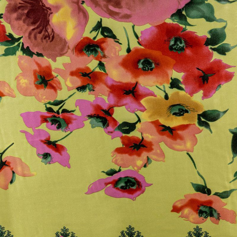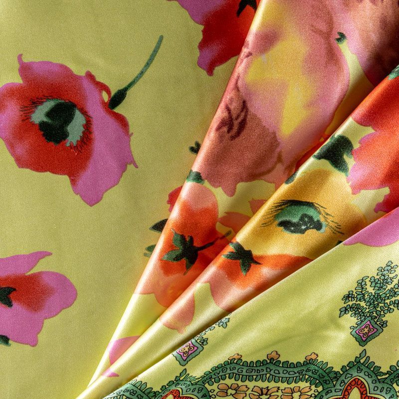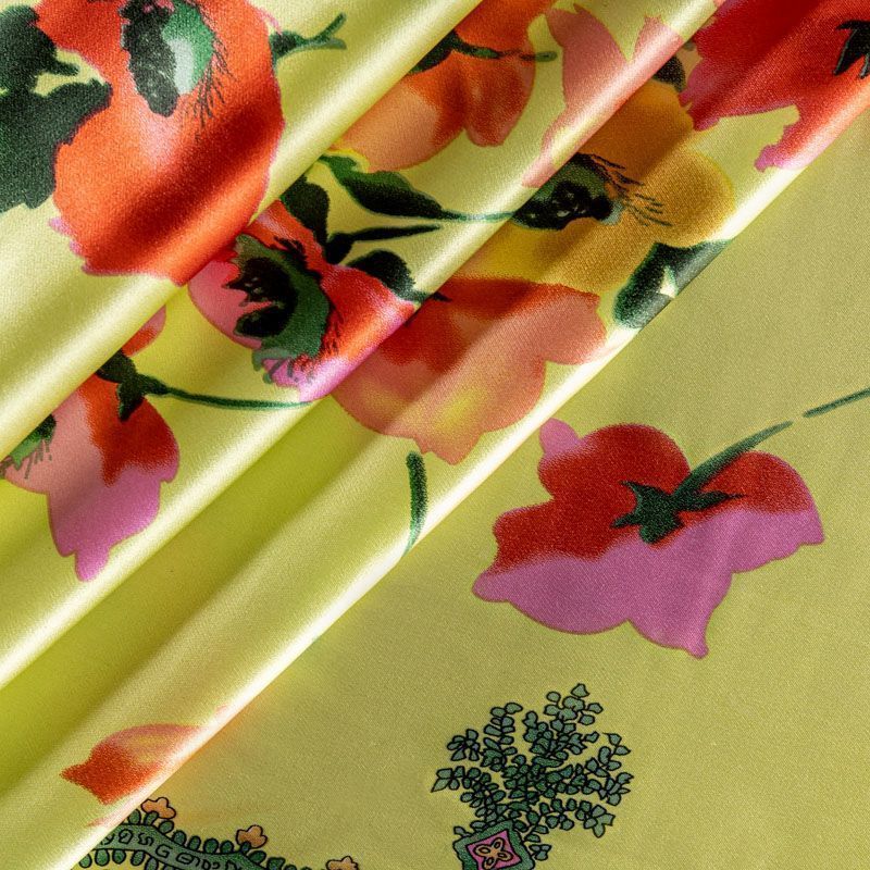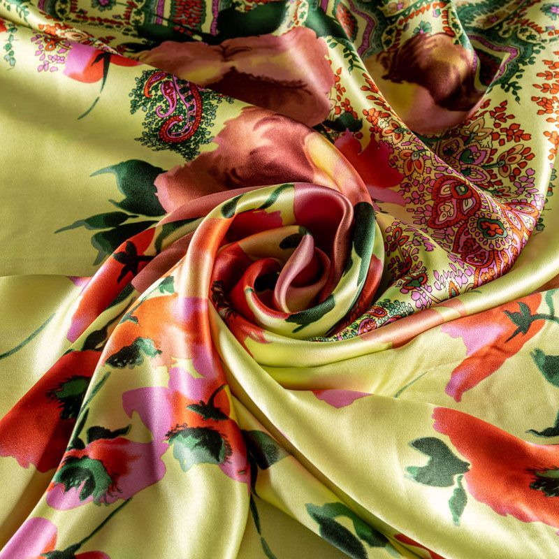 Итальянский натуральный шелк с атласной поверхностью, легкий, струящийся, хорошо драпируется. Яркий цветочный принт на салатовом фоне дополнен по кромке полосой с орнаментом. Ткань набирается объемом. Прекрасно подойдет для пошива летнего сарафана, платья, блузки, костюма в пижамном стиле, широких брюк или юбки.