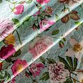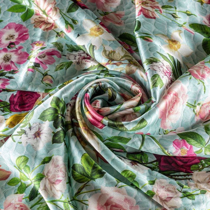 Итальянский атласный шелк с цветочным принтом на мятном фоне, имитирующем фактурную поверхность, тонкий, слегка прозрачный, отлично драпируется,  легкий и струящийся. Идеально подойдет для пошива платьев и сарафанов расклешенных моделей, с воланами, летящих юбок, топов, блузки, костюма в пижамном стиле.