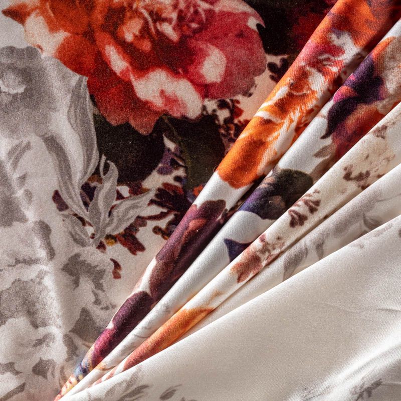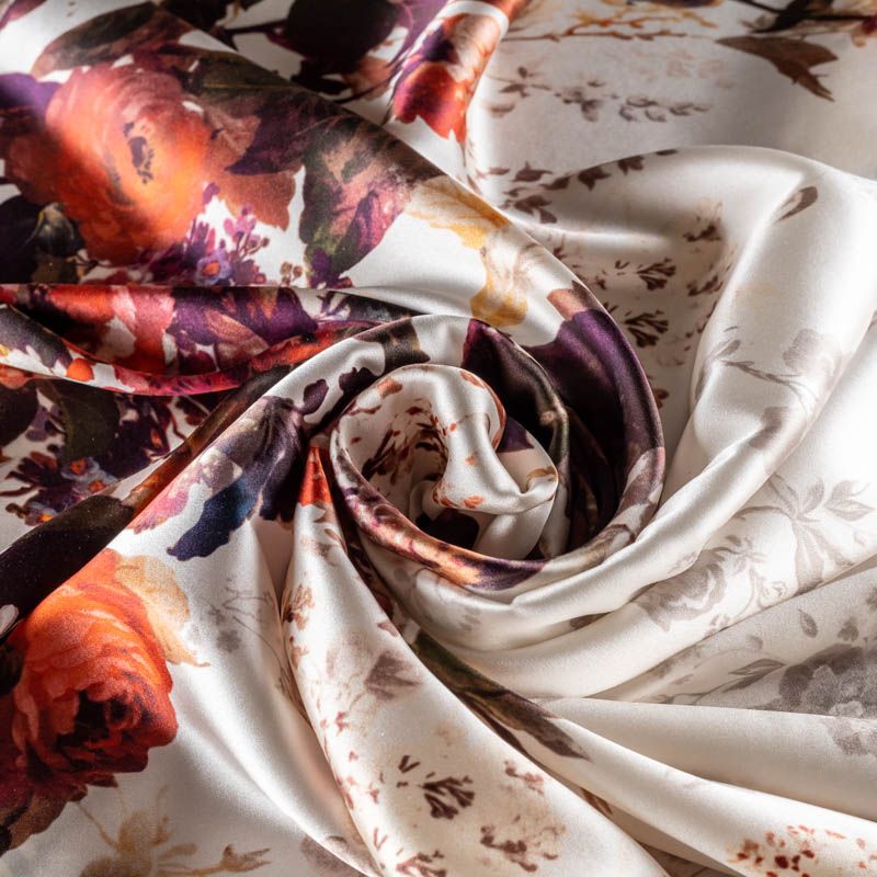 Эффектный и стильный шелк-купон с крупными цветочным принтом в осенней гамме на молочно- жемчужном фоне. Шелк средней плотности, не просвечивает, струится, хорошо драпируется. Поверхность глядкая, имеет благородный сатиновый блеск. Подойдет для летних платьев, накидок, юбок, блузок, костюмов, широких брюк, домашней одежды. Набирается на изделие объемом.
