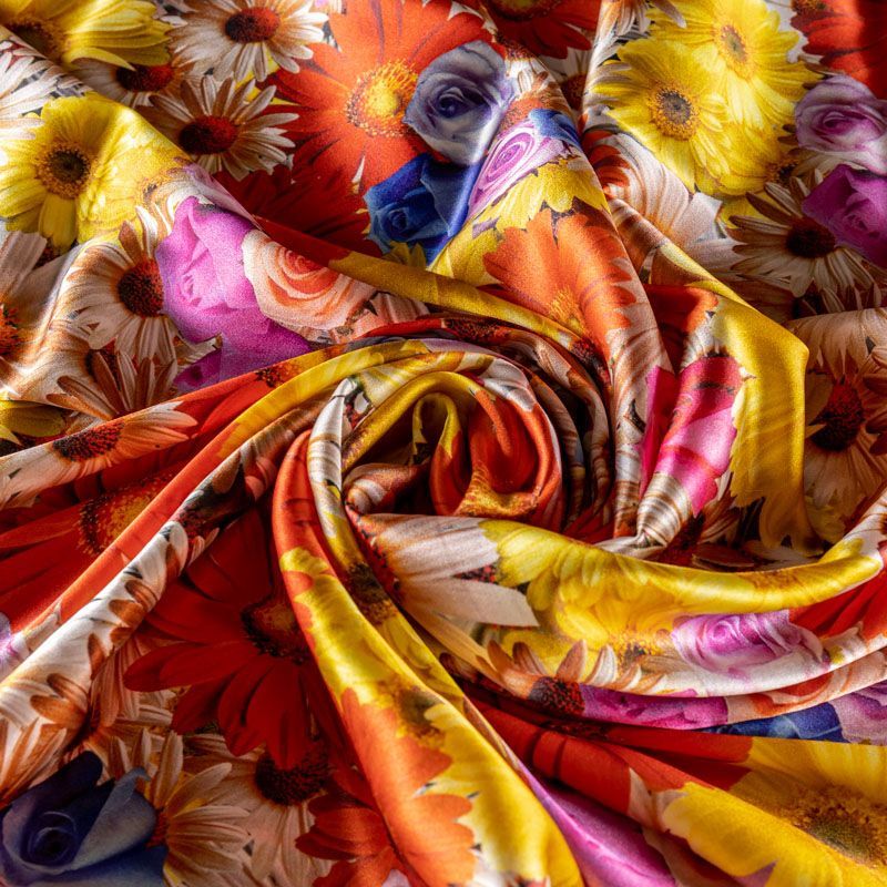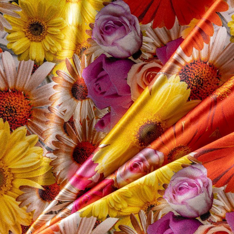 Итальянский шелк с летним ярким цветочным принтом на белом фоне, тонкий, слегка прозрачный, отлично драпируется, легкий и струящийся с атласной поверхностью. Идеально подойдет для пошива платьев и сарафанов расклешенных моделей, с воланами, рюшами, летящих юбок, топов, блузки, рубашки, костюма в пижамном стиле.