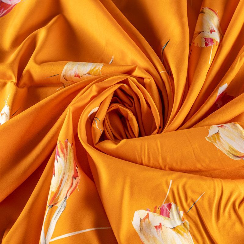 Итальянский шелк с матовой поверхностью, легкий, струящийся, хорошо драпируется. Яркий цветочный принт на оранжевом фоне дополнен по кромке полосками контрастного синего цвета. Ткань набирается объемом. Прекрасно подойдет для пошива летнего сарафана, платья, блузки, костюма в пижамном стиле, широких брюк или юбки.
