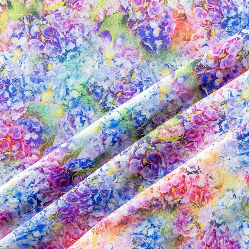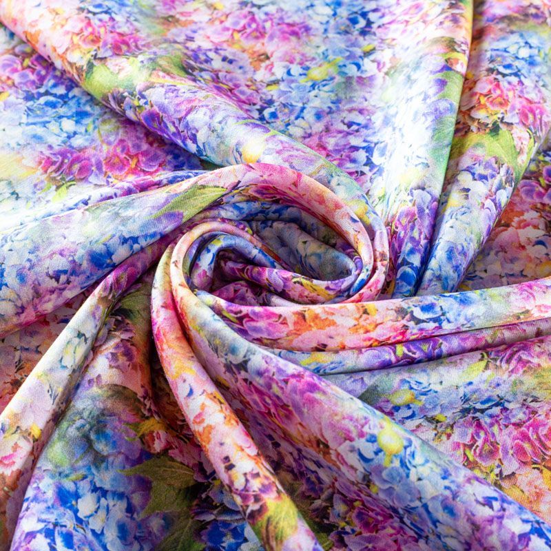 Плательно-блузочный штапель с добавлением шелка с ярким цветочным принтом. Ткань очень мягкая, нежная, пластичная, шелковистая на ощупь, хорошо драпируется, практичная. Особенно актуальна летом, шелк-штапель очень легкий, обволакивающий прохладой. Идеален для пошива летней детской одежды, сарафанов, платьев, юбок, блузок, домашней одежды: халатов, ночной пижамы.