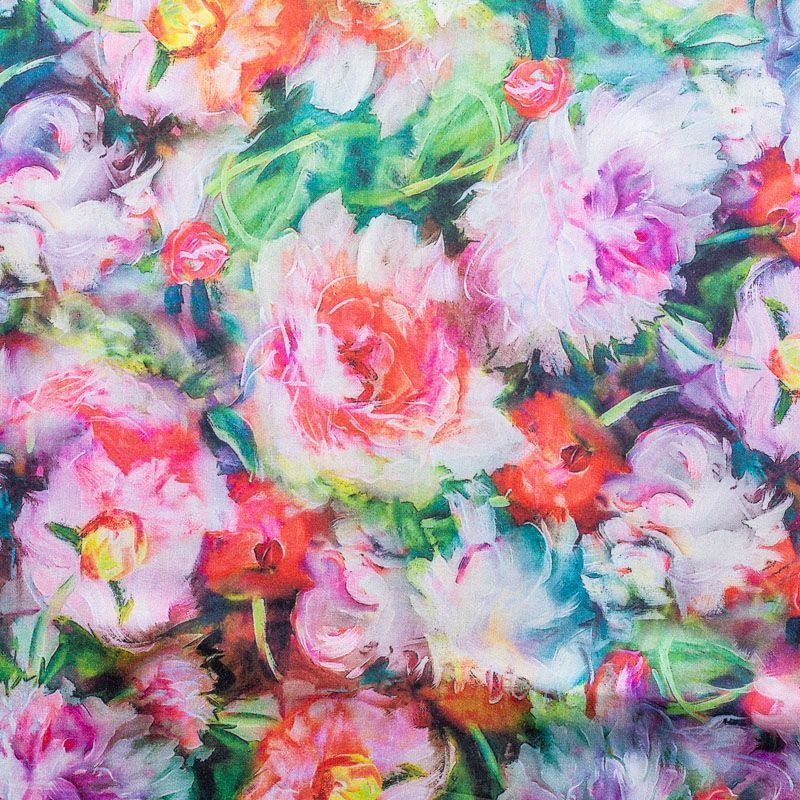 Плательно-блузочный штапель с добавлением шелка с акварельным цветочным принтом. Ткань очень мягкая, нежная, пластичная, шелковистая на ощупь, хорошо драпируется, практичная. Особенно актуальна летом, шелк-штапель очень легкий, обволакивающий прохладой. Идеален для пошива летней детской одежды, сарафанов, платьев, юбок, блузок, домашней одежды: халатов, ночной пижамы.