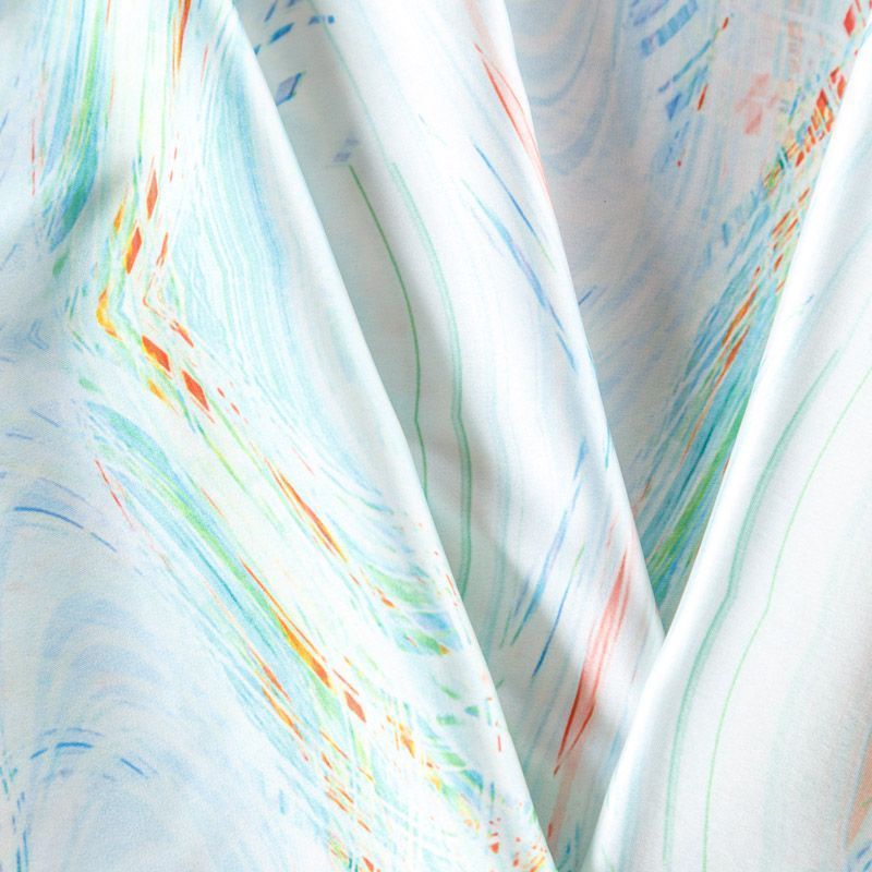 Тонкая, легкая, струящаяся ткань, не просвечивает, очень нежная и прятная к телу, обладает благородным атласным блеском, хорошо драпируется, тянется за счет эластана в составе. Идеально подойдет для пошива блузок, платьев и юбок, а также топов, платков, домашней одежды.