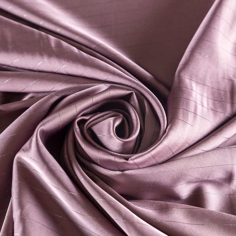 Тонкая, легкая, струящаяся ткань, декорированная тонкими вертикальными полосками люресовой нити, не просвечивает, очень нежная и прятная к телу, обладает благородным атласным блеском, хорошо драпируется, тянется за счет эластана в составе. Идеально подойдет для пошива блузок, платьев и юбок, а также топов, платков, домашней одежды.