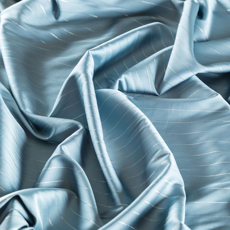 Тонкая, легкая, струящаяся ткань, декорированная тонкими вертикальными полосками люресовой нити, не просвечивает, очень нежная и прятная к телу, обладает благородным атласным блеском, хорошо драпируется, тянется за счет эластана в составе. Идеально подойдет для пошива блузок, платьев и юбок, а также топов, платков, домашней одежды.