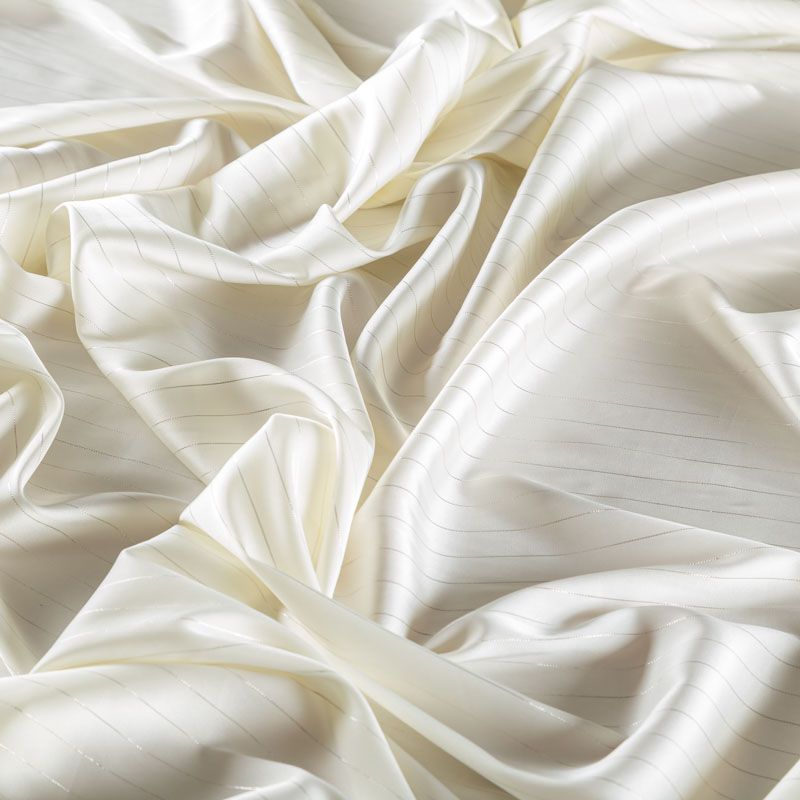 Тонкая, легкая, струящаяся ткань, декорированная тонкими вертикальными полосками люресовой нити, не просвечивает, очень нежная и прятная к телу, обладает благородным атласным блеском, хорошо драпируется, тянется за счет эластана в составе. Идеально подойдет для пошива блузок, платьев и юбок, а также топов, платков, домашней одежды.