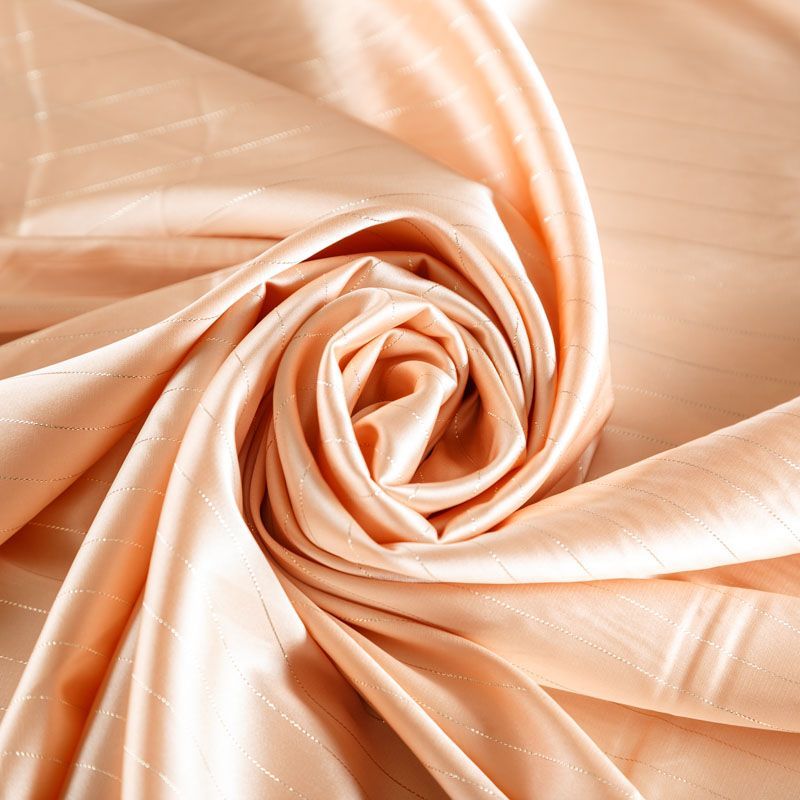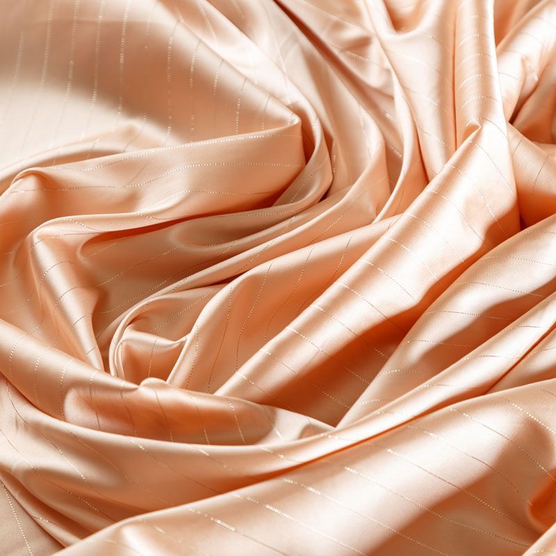 Тонкая, легкая, струящаяся ткань, декорированная тонкими вертикальными полосками люресовой нити, не просвечивает, очень нежная и прятная к телу, обладает благородным атласным блеском, хорошо драпируется, тянется за счет эластана в составе. Идеально подойдет для пошива блузок, платьев и юбок, а также топов, платков, домашней одежды.