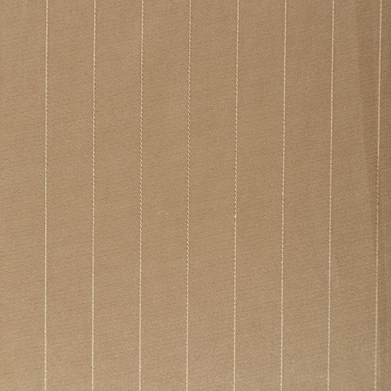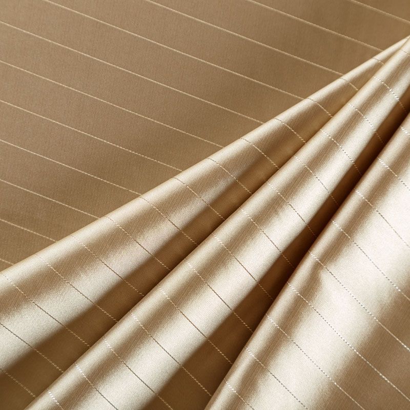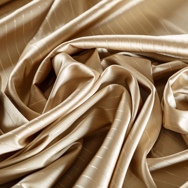 Тонкая, легкая, струящаяся ткань, декорированная тонкими вертикальными полосками люресовой нити, не просвечивает, очень нежная и прятная к телу, обладает благородным атласным блеском, хорошо драпируется, тянется за счет эластана в составе. Идеально подойдет для пошива блузок, платьев и юбок, а также топов, платков, домашней одежды.