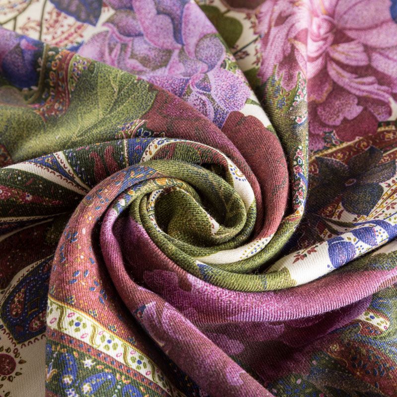 Итальянский плательный кашемир с добавлением шелка молочного оттенка цветочным принтом. Ткань тонкая, мягкая и пластичная, отлично драпируется. Поверхность матовая с твиловым плетением нитей. Прекрасно подойдет для создания осенних платьев, теплых туник, юбок, кофточек, а также аксессуаров, таких как палантины, шарфы, платки.