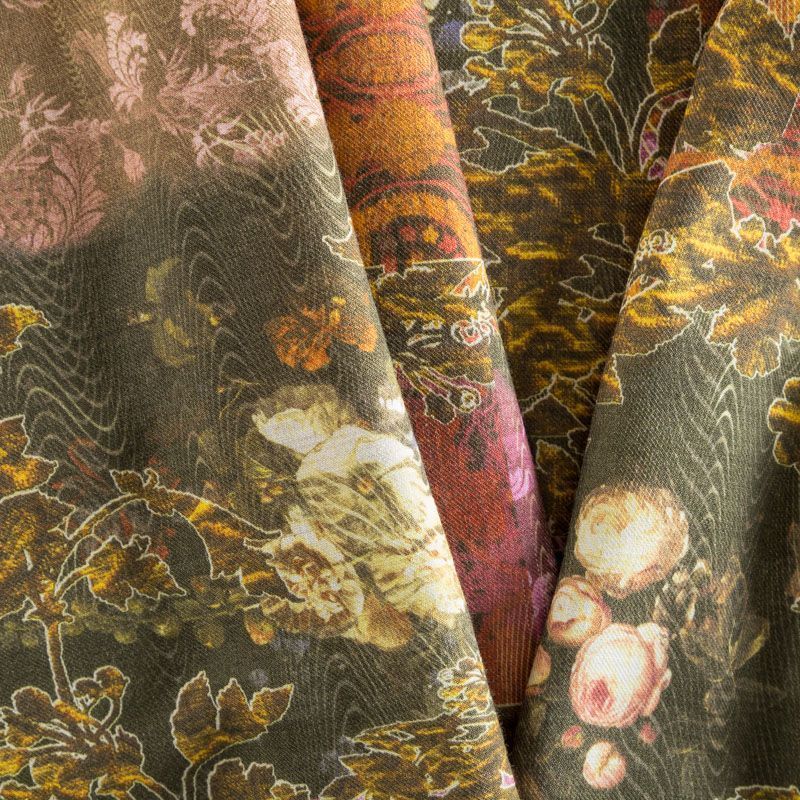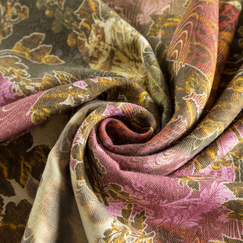 Итальянская плательная шерсть оттенка хаки со сложным принтом, сочетающим в себе флористическую и анималистическую темы. Ткань тонкая, мягкая и пластичная, отлично драпируется. Поверхность матовая с твиловым плетением нитей. Прекрасно подойдет для создания осенних платьев, теплых туник, юбок, кофточек, а также аксессуаров, таких как палантины, шарфы, платки.