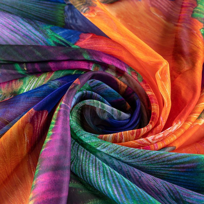Шифон синего цвета с крупным цветочным принтом в ярких оттенках. Струящийся, летящий, воздушный, полупрозрачный. На ощупь мягкий и приятный.Подойдет для пошива тончайших воздушных блуз, изумительных вечерних платьев и элегантных шарфов.
