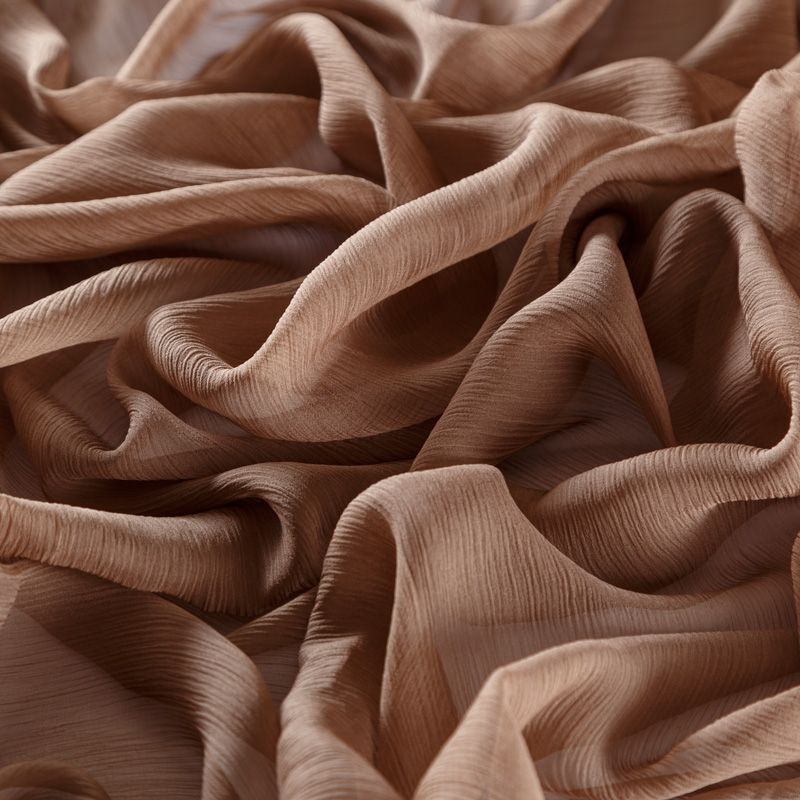 Воздушная шелковая жатая ткань, легкая, тонкая, полупрозрачная. На ощупь шифон-жатка очень мягкий и приятный, не тянется. Подойдет для пошива тончайших воздушных блуз, изумительных вечерних и летних платьев в пол, коротких коктейльных платьев, топов, блузок, туник и элегантных шарфов.