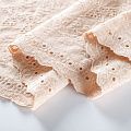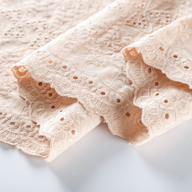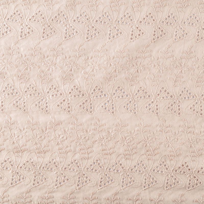 Мягкий и нежный хлопок бежевого оттенка с вышивкой и перфорацией. Узор выполнен путём машинной вышивки нитками в цвет ткани и расположен по всему полотну, обе кромки оформлены фестонами. Фактура ткани однородная, имеет тенденцию к сминаемости, не тянется, приятная на ощупь. Может потребоваться подклад. Идеально подходит для создания летних платьев, сарафанов, юбок, блузок и топов.