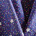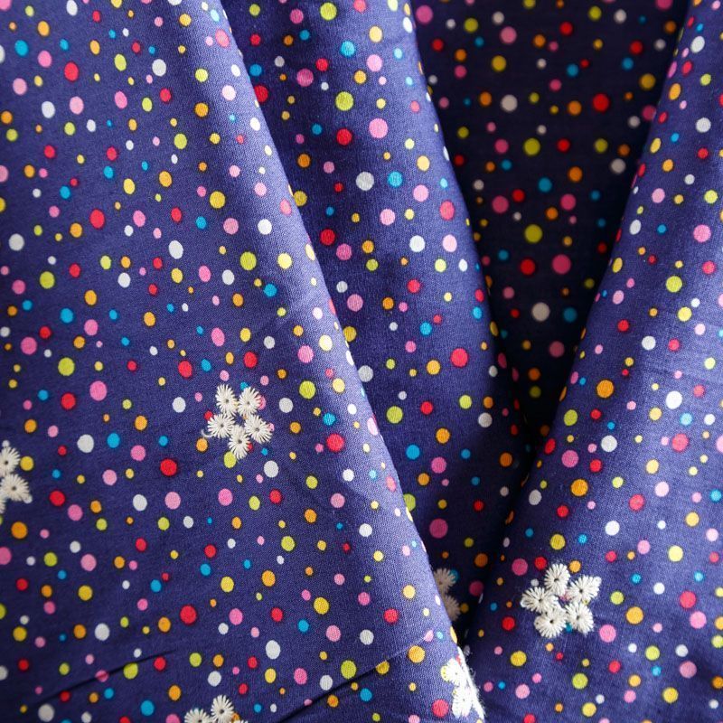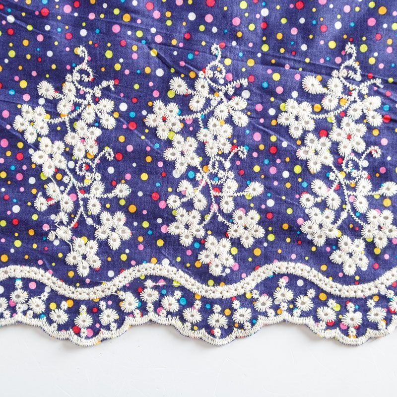 Мягкий и нежный хлопок синего цвета с мелким цветным принтом принтом украшен контрастной вышивкой. Узор выполнен путём машинной вышивки и расположен вдоль одной кромки, образуя фестон, поэтому набирается на изделие объемом. Ткань легкая, не сухая, хорошо драпируется и держит форму, имеет тенденцию к сминаемости, не просвечивает, не тянется, приятная на ощупь. Идеально подходит для создания летних платьев, сарафанов, юбок, блузок, топов, шорт.