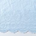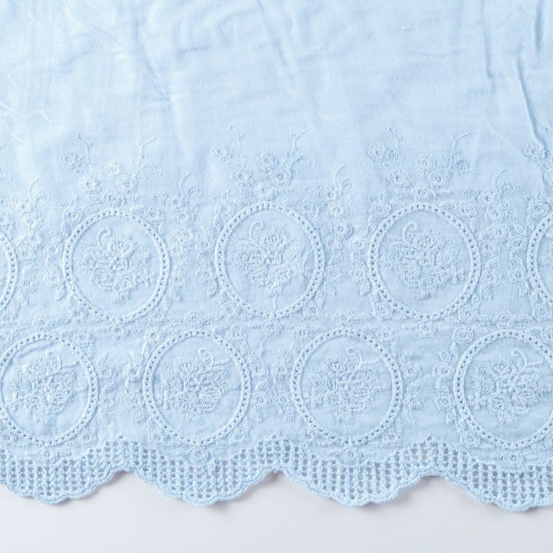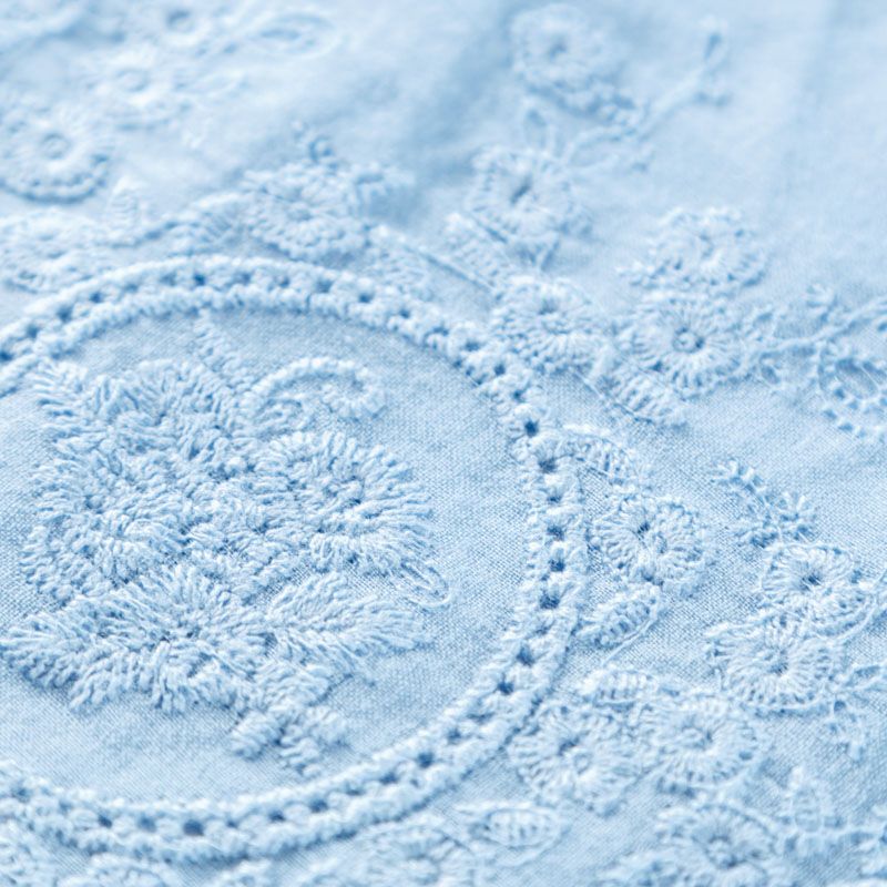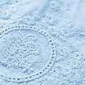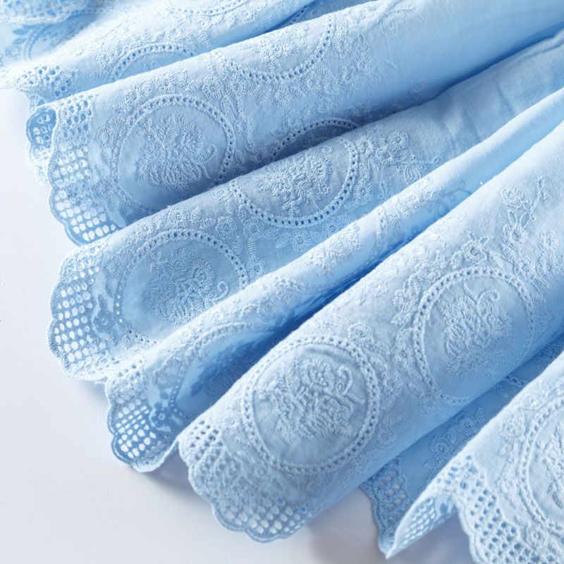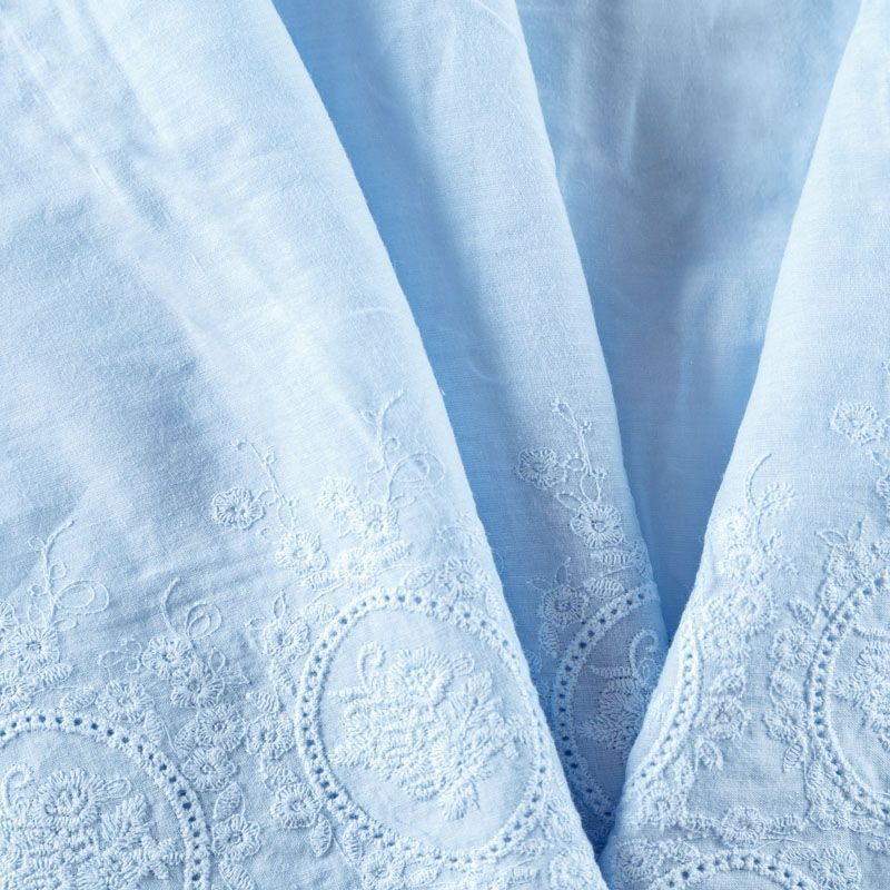 Мягкий и нежный хлопок голубого оттенка с изящной вышивкой. Узор выполнен путём машинной вышивки нитками в цвет ткани и расположен вдоль кромки. Фактура ткани однородная, имеет тенденцию к сминаемости, просвечивает, не тянется, приятная на ощупь. Идеально подходит для создания летних платьев, сарафанов, юбок, блузок и топов.