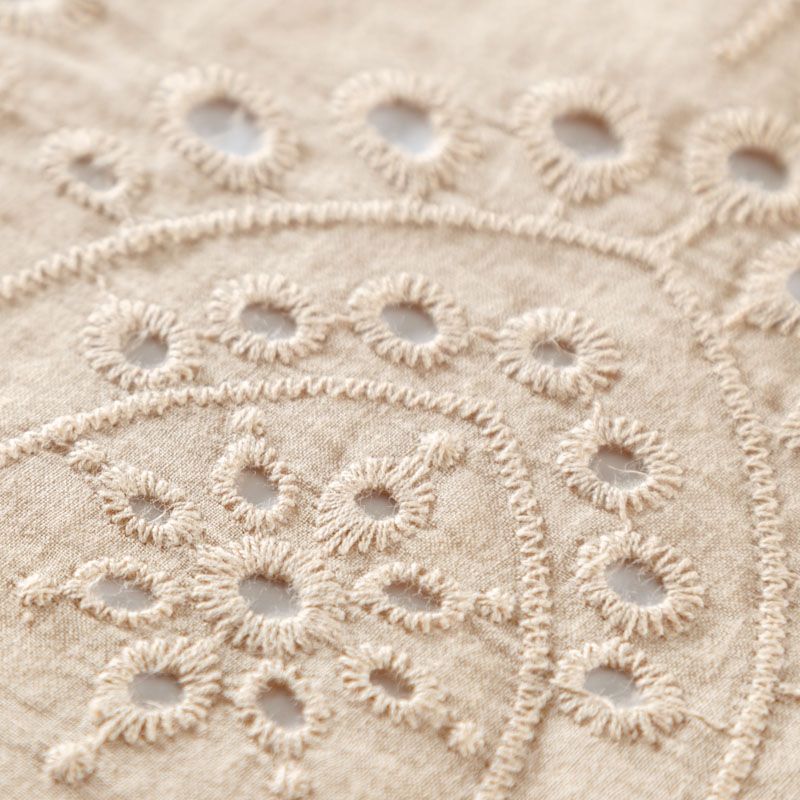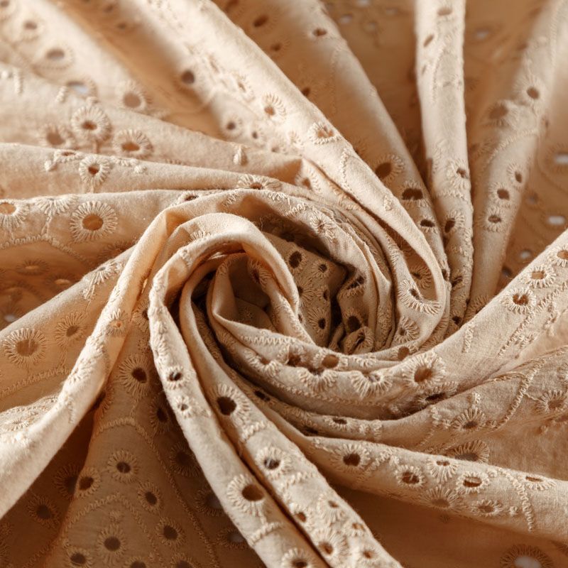 Итальянское шитье на бежевой хлопковой основе с геометрической, элегантной вышивкой, расположеннной по всему полотну. Ткань мягкая, легкая, пластичная, приятная на ощупь, просвечивает, потребуется подклад. Обе кромки ткани оформлены фигурными фестонами. Идеально подойдет для пошива рубашки, блузы, топа в воланами, туники, платья, сарафана, юбки, шорт.