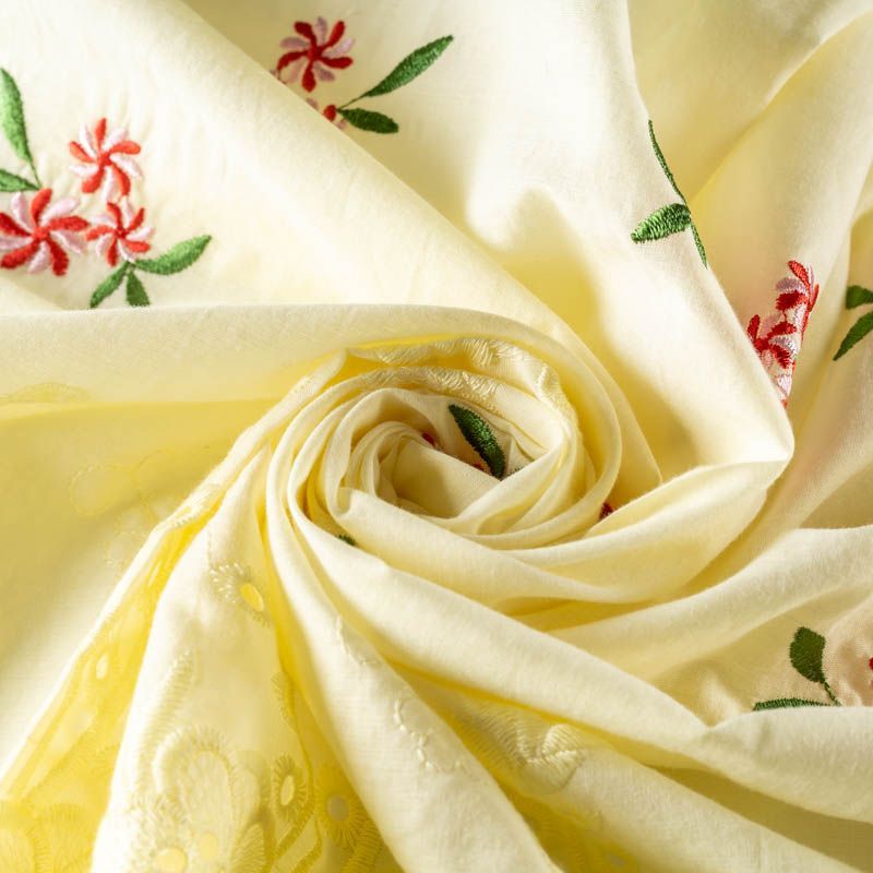 Мягкий хлопок желтого оттенка с яркой цветочной вышивкой. Фактура ткани гладкая, имеет тенденцию к сминаемости, немного просвечивает, не тянется, приятная на ощупь. Хлопок прекрасно пропускает воздух, идеально подходит для создания летних платьев, сарафанов, юбок, блузок и топов. Ткань идет купоном (каймой) вдоль одной кромки. Купон выполнен путём машинной вышивки нитками в цвет ткани. Набирается объемом.