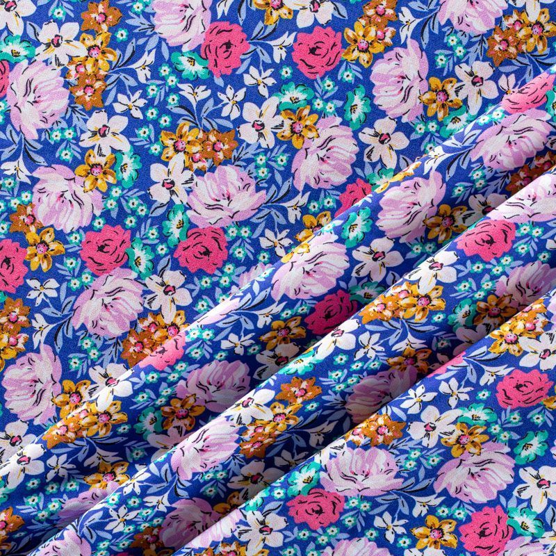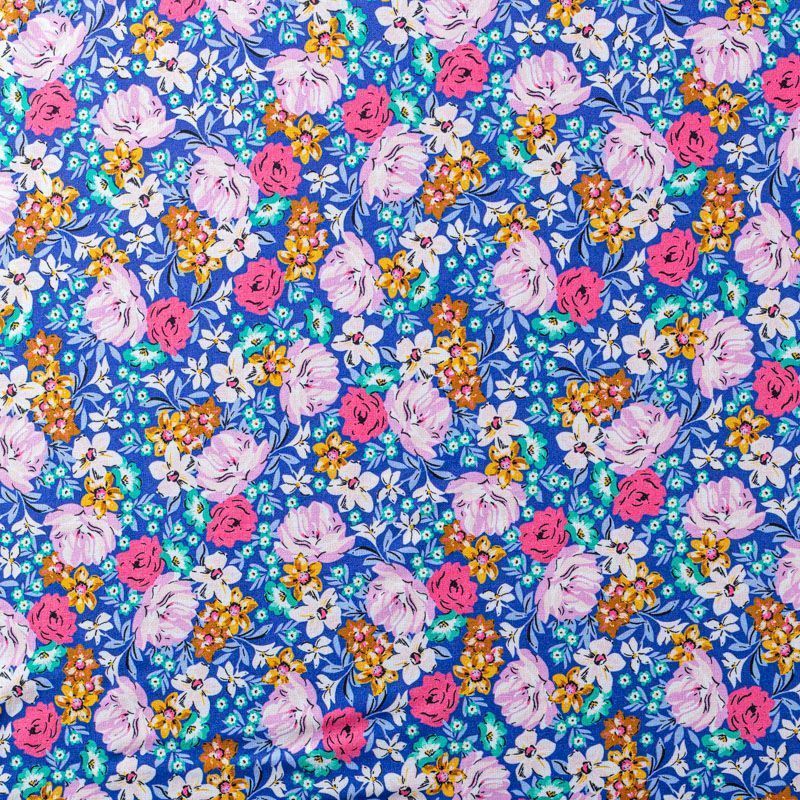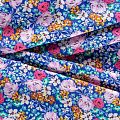 Плательно-блузочный штапель с нежным цветочным принтом на насыщенном синем фоне. Мягкий, тонкий, нежный, пластичный, приятный на ощупь, хорошо драпируется, практичный. Подойдет для пошива платья, топа, блузки, рубашки, юбки, летних брюк.
