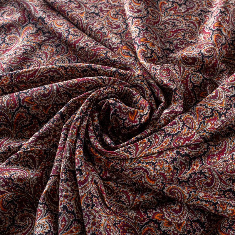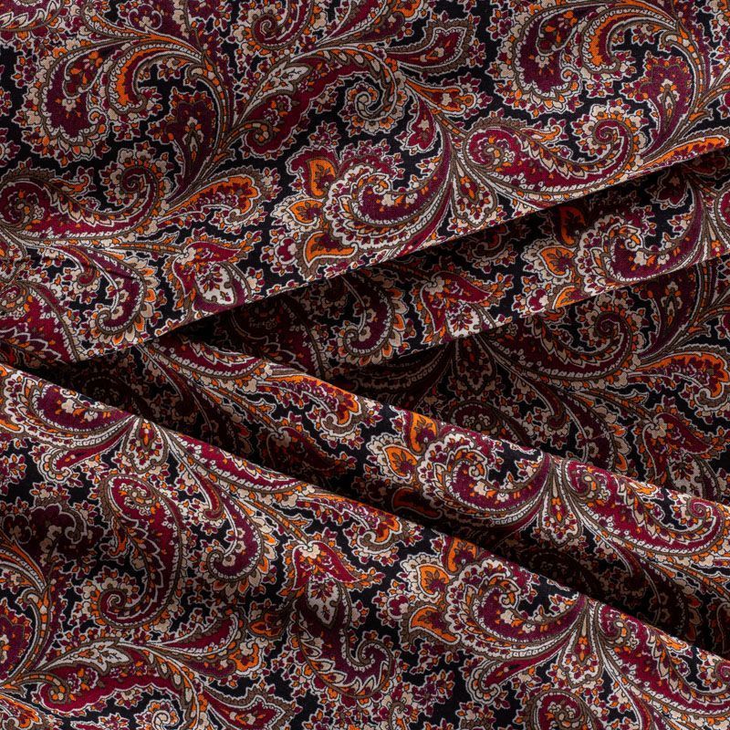 Плательно-блузочный штапель с принтом пейсли в коричнево-желтых оттенках на черном фоне. Мягкий, тонкий, нежный, пластичный, приятный на ощупь, хорошо драпируется, практичный. Подойдет для пошива платья, топа, блузки, рубашки, юбки, летних брюк.