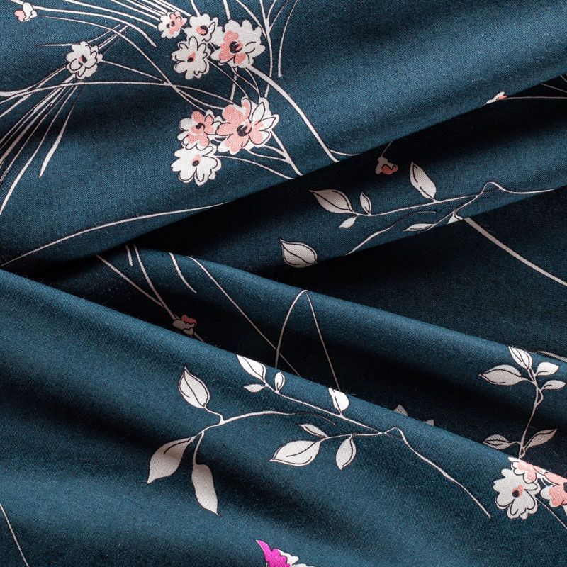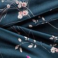 Итальянский плательно-блузочный штапель глубокого сине-зеленого оттенка с цветочным принтом и декоративным кантом вдоль кромки. Мягкий, нежный, пластичный, приятный на ощупь, хорошо драпируется, практичный. Особенно актуален летом, он очень легкий, обволакивающий прохладой. Идеален для пошива летней детской одежды, сарафанов, платьев, юбок, блузок, домашней одежды: халатов, ночной пижамы.