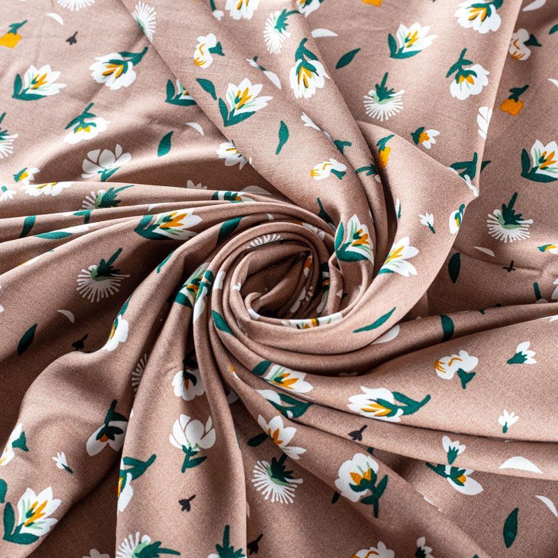 Плательно-блузочный штапель с цветочным принтом на пепельно-коричневом фоне. Мягкий, тонкий, нежный, пластичный, приятный на ощупь, хорошо драпируется, практичный. Подойдет для пошива платья, топа, блузки, рубашки, юбки, летних брюк.