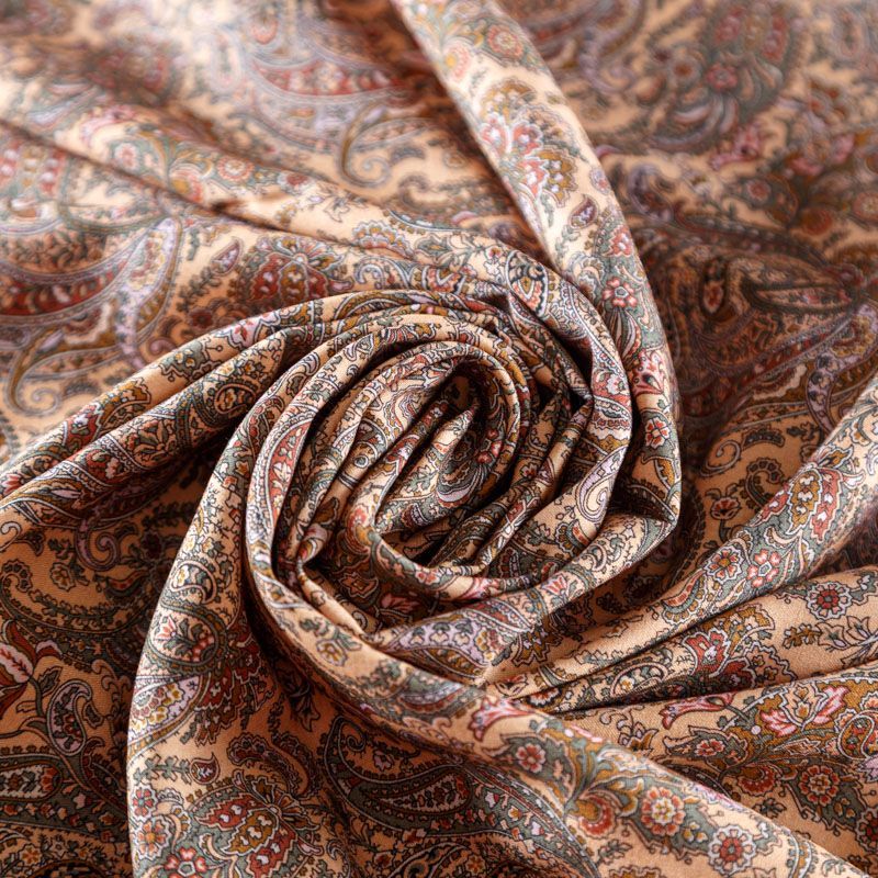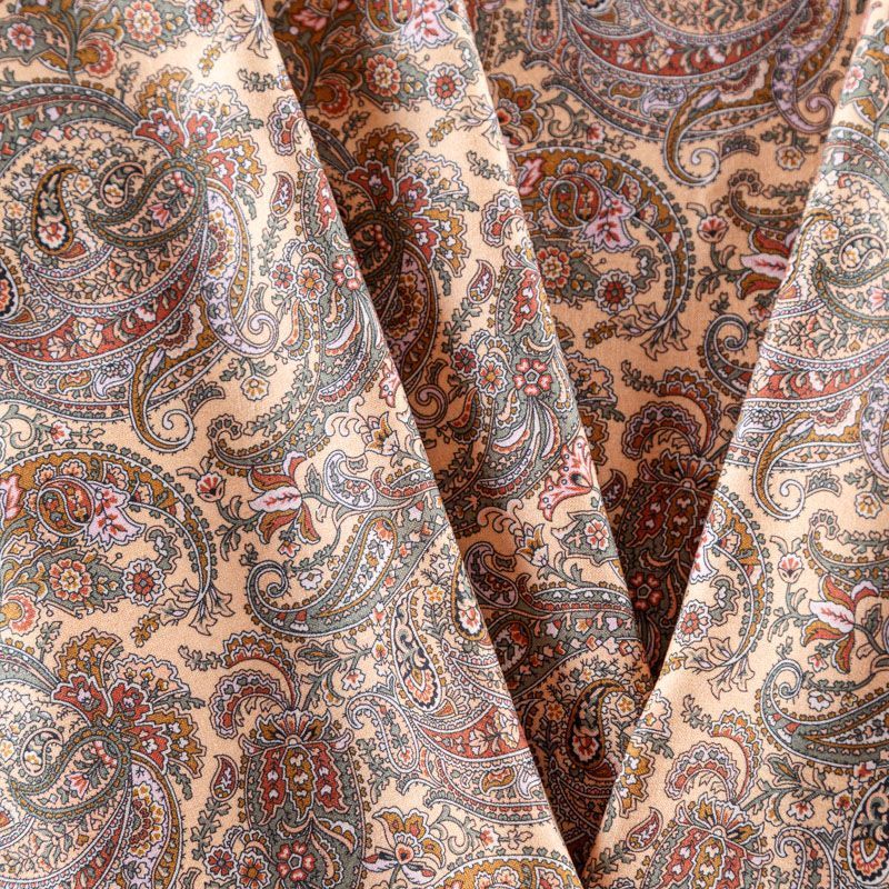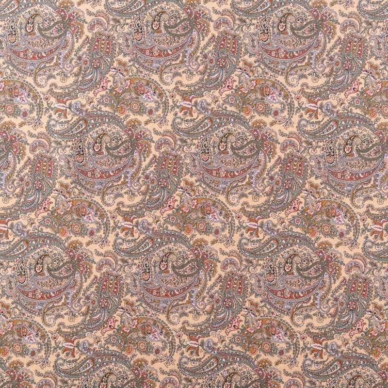Итальянский плательно-блузочный штапель бежевого оттенка с богатым принтом пейсли. Ткань мягкая, тонкая, нежная и пластичная, приятная на ощупь, хорошо драпируется, практичная. Подойдет для пошива платья, топа, блузки, рубашки, юбки, летних брюк.