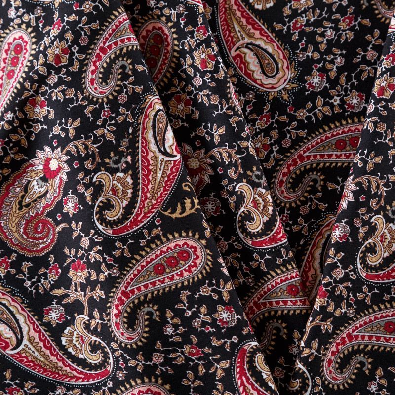 Плательно-блузочный штапель с принтом пейсли на черном фоне. Мягкий, тонкий, нежный, пластичный, приятный на ощупь, хорошо драпируется, практичный. Подойдет для пошива платья, топа, блузки, рубашки, юбки, летних брюк, комбинезона.