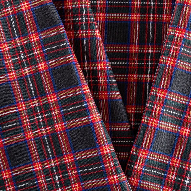 Ткань костюмно-плательной плотности, мягкая и приятная на ощупь, немного тянется за счет эластана в составе, держит форму, хорошо драпируется и образует мягкие складки. Сочетание тонких линий белого, красного, желтого и синего цветов на черном фоне образует сложную красивую клетку. Ткань отлично подойдет на костюмы, юбки, брюки, шорты, платья, жакеты.