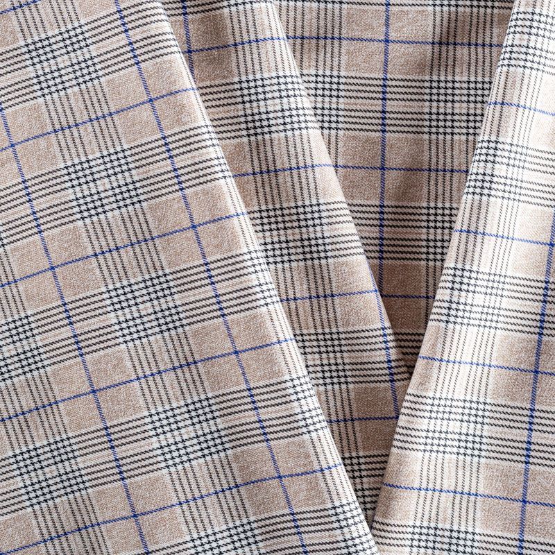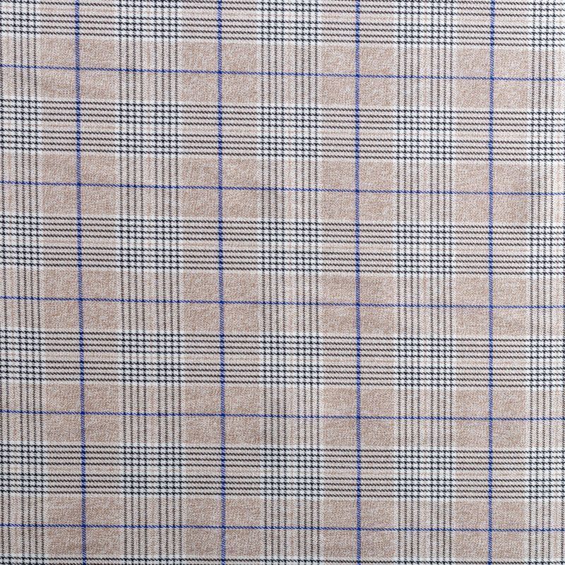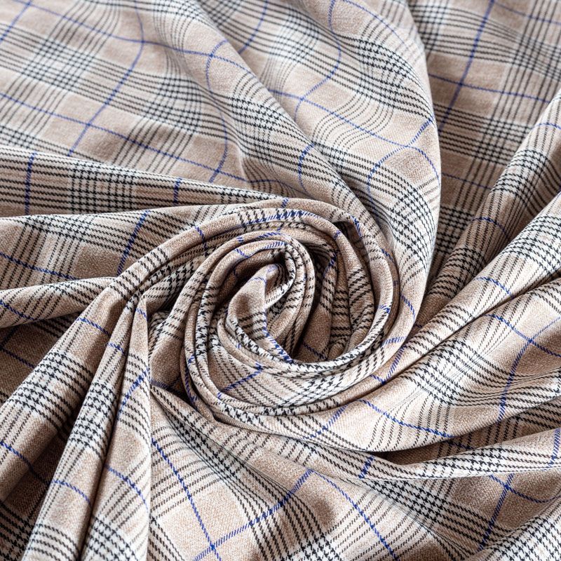 Ткань костюмно-плательной плотности, мягкая и приятная на ощупь, немного тянется за счет эластана в составе, держит форму, хорошо драпируется и образует мягкие складки. Сочетание тонких линий синего, черного и белого цветов на песочном фоне образует сложную элегантную клетку. Ткань отлично подойдет на костюмы, юбки, брюки, шорты, платья, жакеты.
