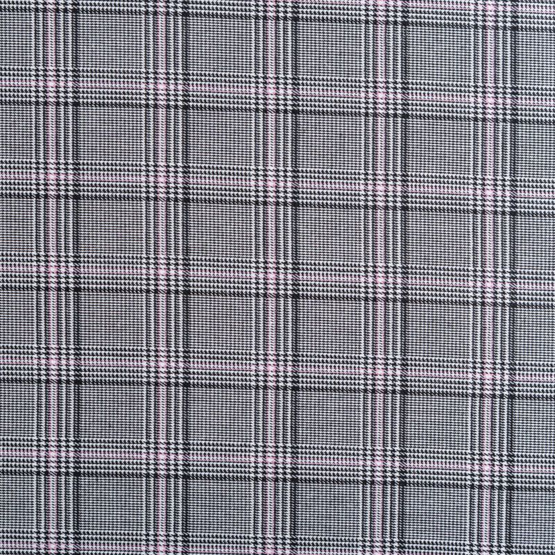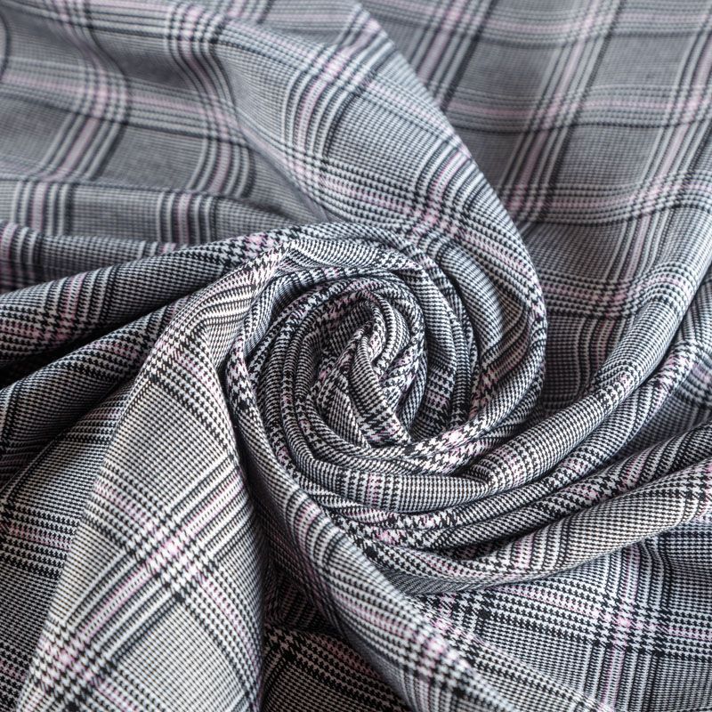Ткань средней плотности, легкая и мягкая, приятная на ощупь, немного эластичная, хорошо драпируется и образует мягкие складки. Сочетание линий серого, белого и розового оттенков и принта "гусиная лапа" образует сложную красивую клетку. Монохромный строгий принт разбавляет еле уловимая элегантная тонкая полоска розового цвета. Ткань отлично подойдет на костюмы, юбки, брюки, платья, жакеты.