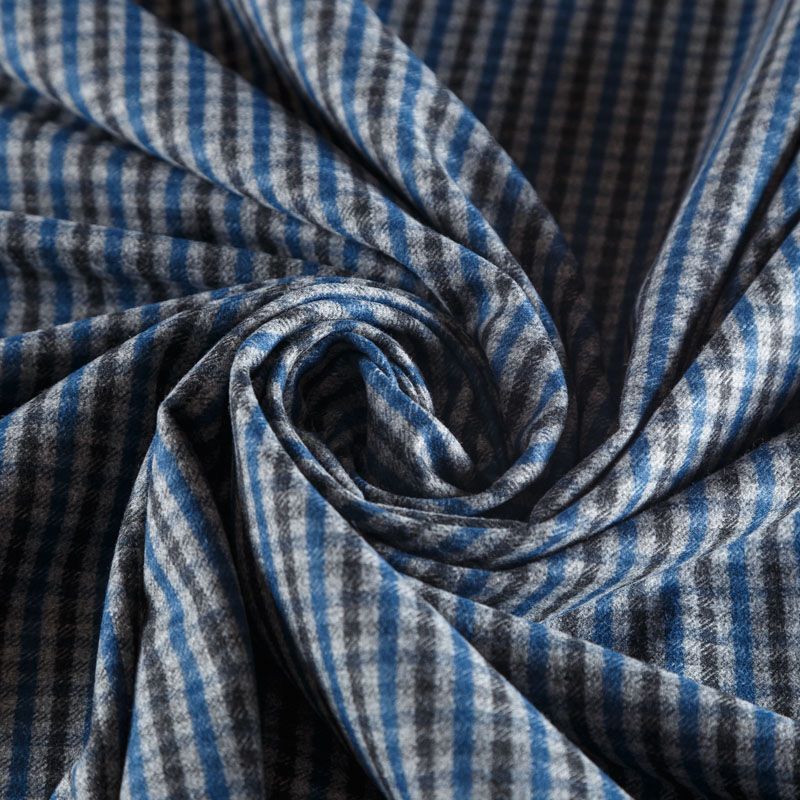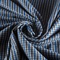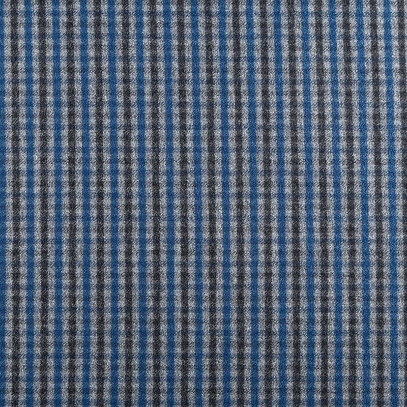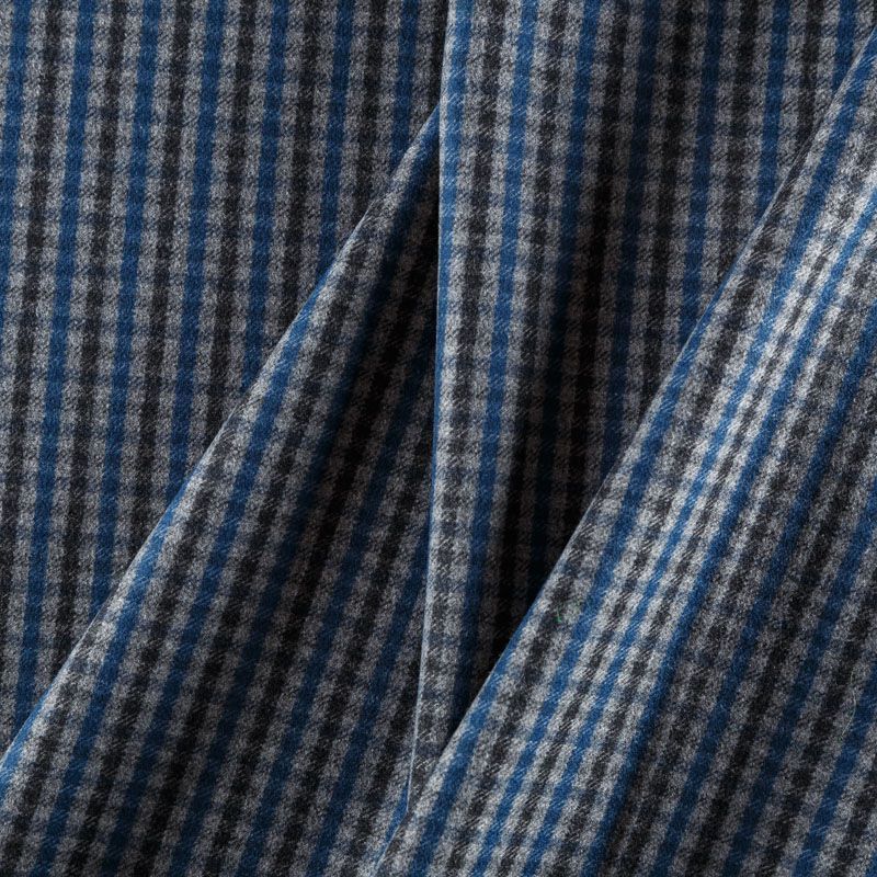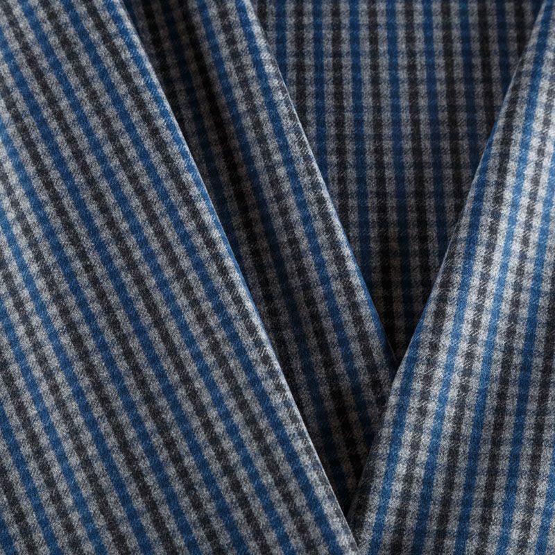 Итальянская костюмно-плательная ткань средней плотности, не сухая, пластичная, приятная на ощупь, тянется за счет эластана в сотаве, формоустойчива, не мнется, хорошо драпируется. Мелкая клетка образована за счет сочетания полос черного, синего и серого оттенков. Ткань отлично подойдет на костюмы, юбки, брюки, платья, жакеты, сарафаны, шорты.