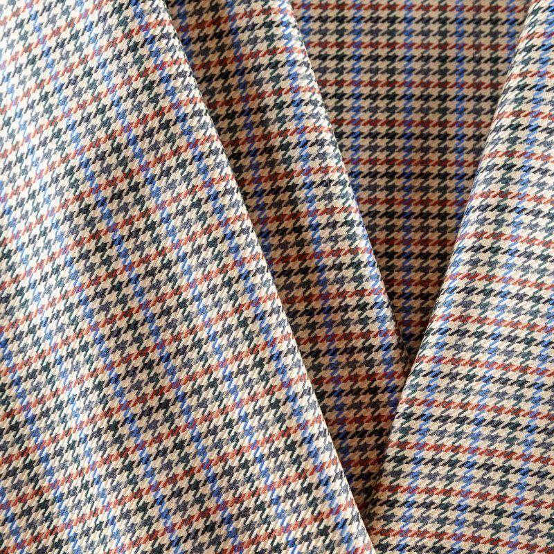 Итальянская костюмно-плательная шерсть средней плотности в актуальном бежевом оттенке с классическим узором гусиная лапка в черно-синиих цветах. Поверхность ткани имеет выраженное диагональное плетение, на ощупь гладкая, полированная благодаря содержанию шерсти ламы. Ткань очень мягкая, теплая, уютная, шерсть не колется, в носке очень комфортная. Подойдет для пошива стильного костюма, мужского пиджака, платья, жакета, юбки, шорт или легкого пальто для осенне-весеннего сезона.